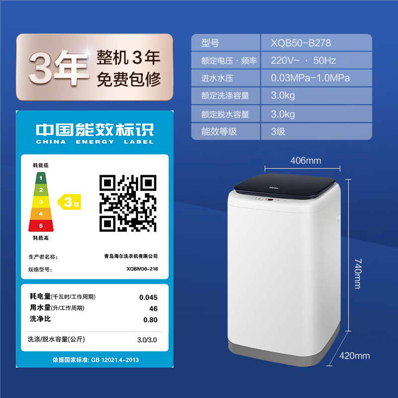 海尔(Haier)这款型号为XQBM30-218的迷你滚筒洗衣机,专为儿童打造,洗涤容量3公斤,整机尺寸小巧,占地仅0.17平方米,可适应家居各种狭小空间。轻柔水流揉搓,防止衣物变形、磨损。具备10分钟快速洗涤。洗涤功率265W,脱水功率220w。产品尺寸420*406*740。