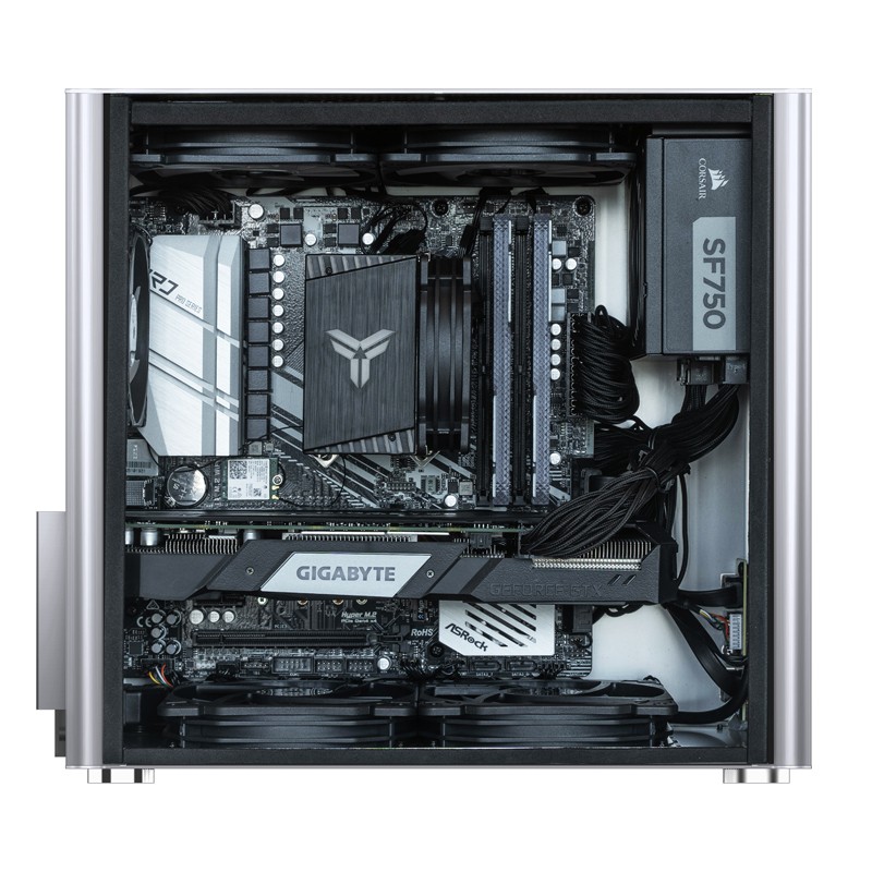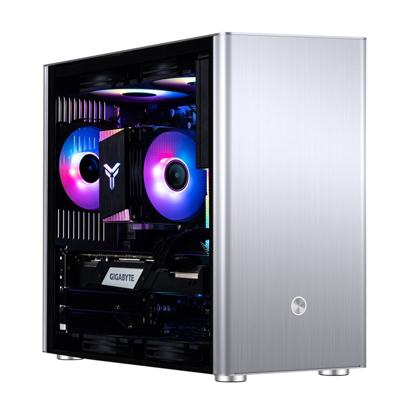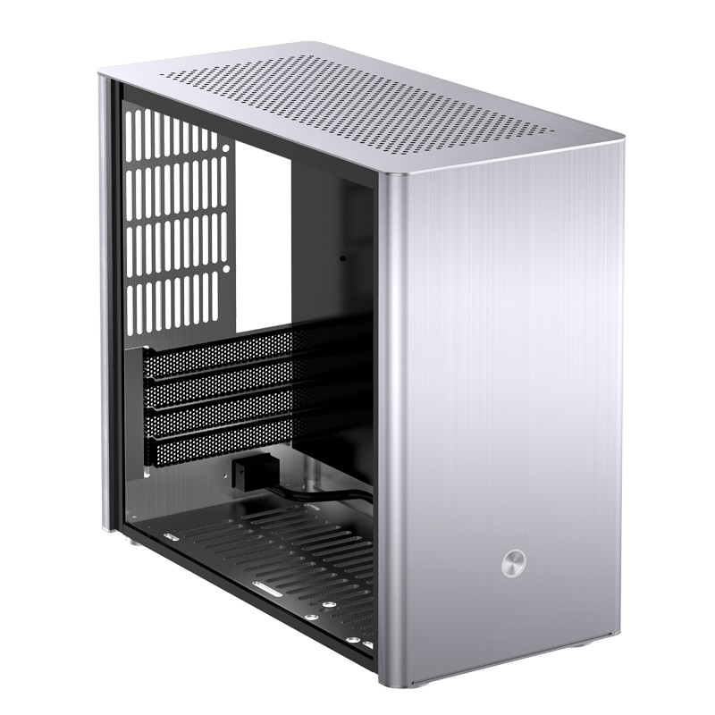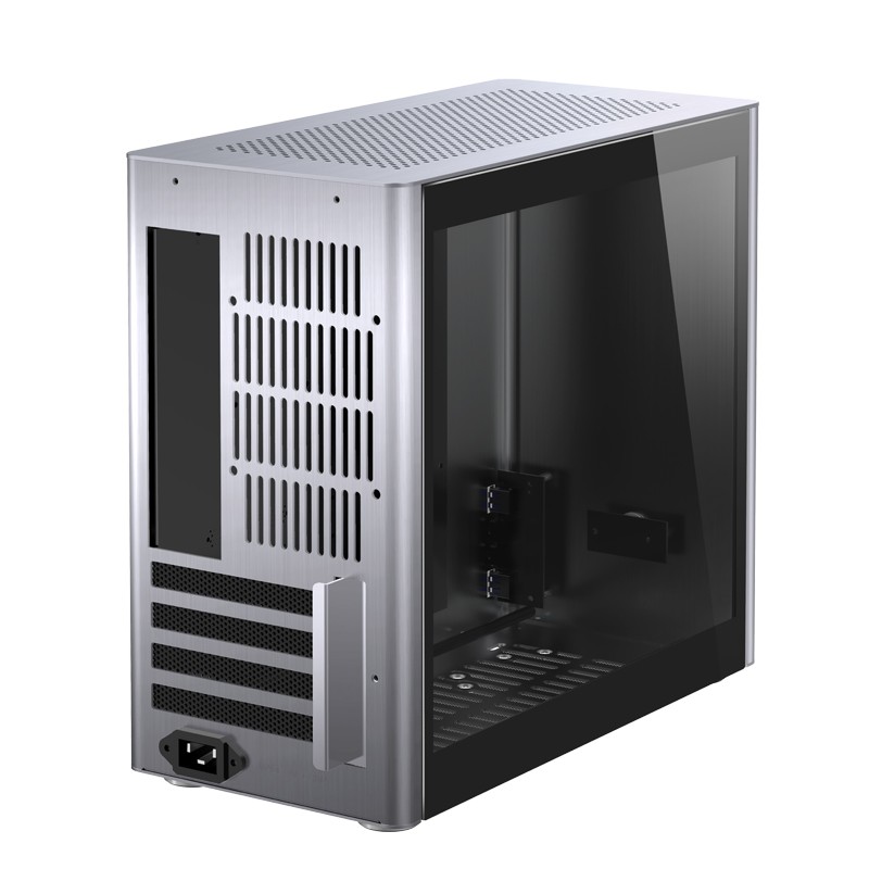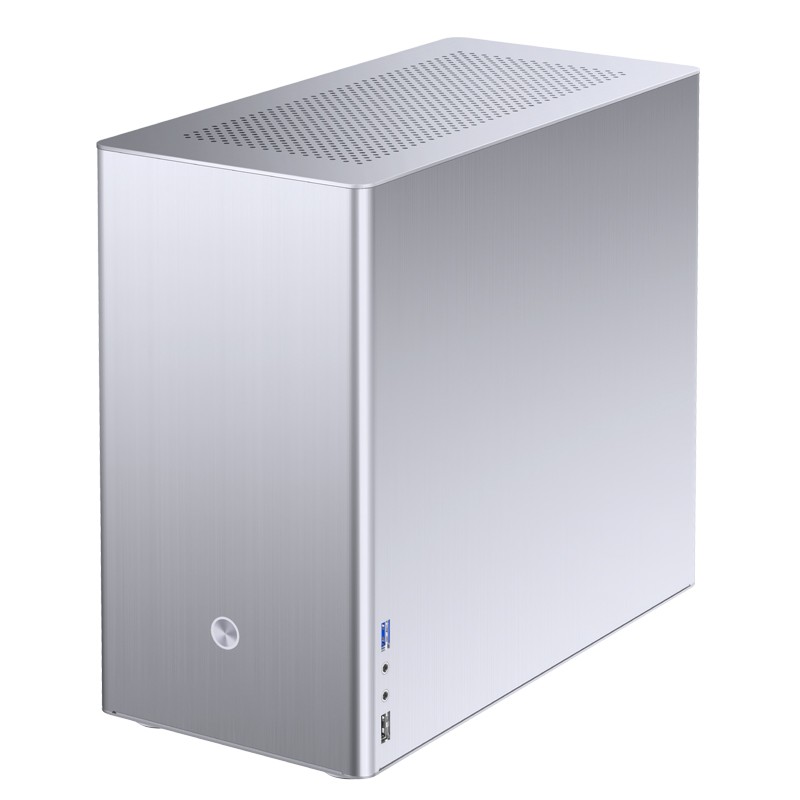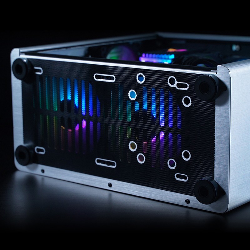 这款机箱也同样小巧走精致路线,专为M-ATX平台设计,采用铝制材质,内结构部署以及通风布局都非常不错,适合用来搭建精致M-ATX平台。精致简约设计,有黑和银色两种颜色可选,表面都有拉丝工艺,一体无缝打造而成,顶部和尾部面板是CNC工艺,底部有四个精致烫金拉丝脚垫,还有大面积的防尘滤网等。I/O扩展的位置设在了右侧面板底部,包括双USB 3.0、3.5mm耳麦插孔,前脸底部只保留一个开机按键。另外,左侧是块完整的超大钢化玻璃侧透,上下以及两侧有黑边掩饰处理,主要是遮挡机箱框架。规格方面,机身尺寸为337x317x165mm,净重2.7公斤。内可兼容ITX/MATX主板,能容纳下133mm高CPU散热器,290mm长显卡(4槽)以及17cm长电源(SFX、SFX-L),提供一个2.5英寸SSD或3.5英寸HDD仓位。