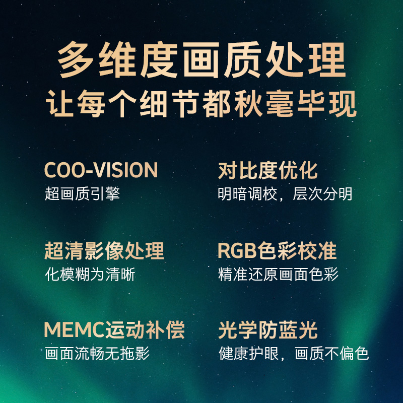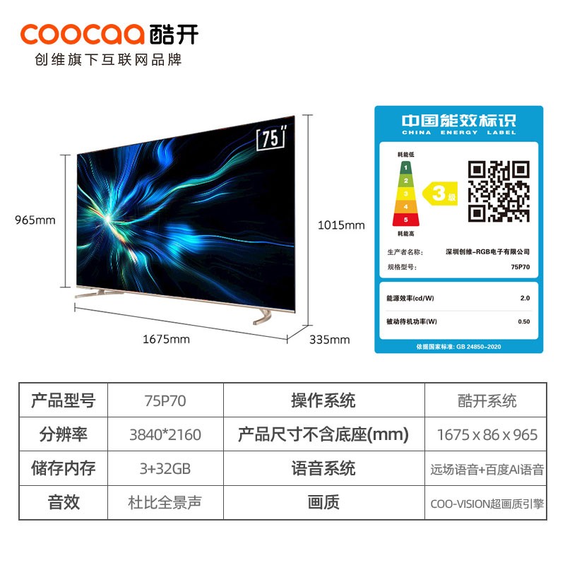 这款型号为75P70的液晶电视属于酷开(coocaa)20年8月新上市的旗舰系列P70系列,搭载多项画质技术,4K HDR和Coo-Vision从对比度、清晰度、色彩、运动和降噪五大维度对画面进行优化处理,使画面质感在全方位得到提升。还具备MEMC运动补偿技术以及拥有多达5184个背光分区,实现对画面各个区域色彩明暗的精准控制。电视内置高品质麦克风阵列,可实现远场语音控制,支持10米拾音、99.96%识别准确率、0.5s响应速度的“快、远、稳”体验,语音操控简单返璞。硬件方面,产品采用A73*2+A53*2的CPU,并搭配3+32GB大内存模组,保证系统日常使用的流畅性。配备了采用密度低、重量轻的云母振膜喇叭,中低音反应快速不拖沓,声场有层次,解析力分明。音效上结合杜比全景声技术,带来立体环绕的观影效果,营造包裹式立体声场。音效方面,支持DTS+HD音效。