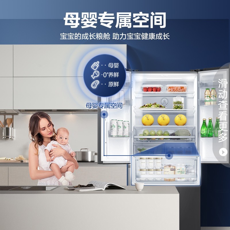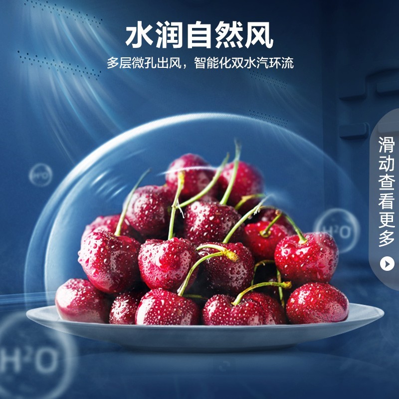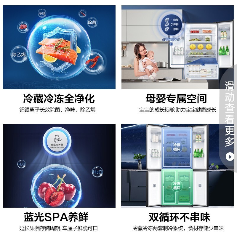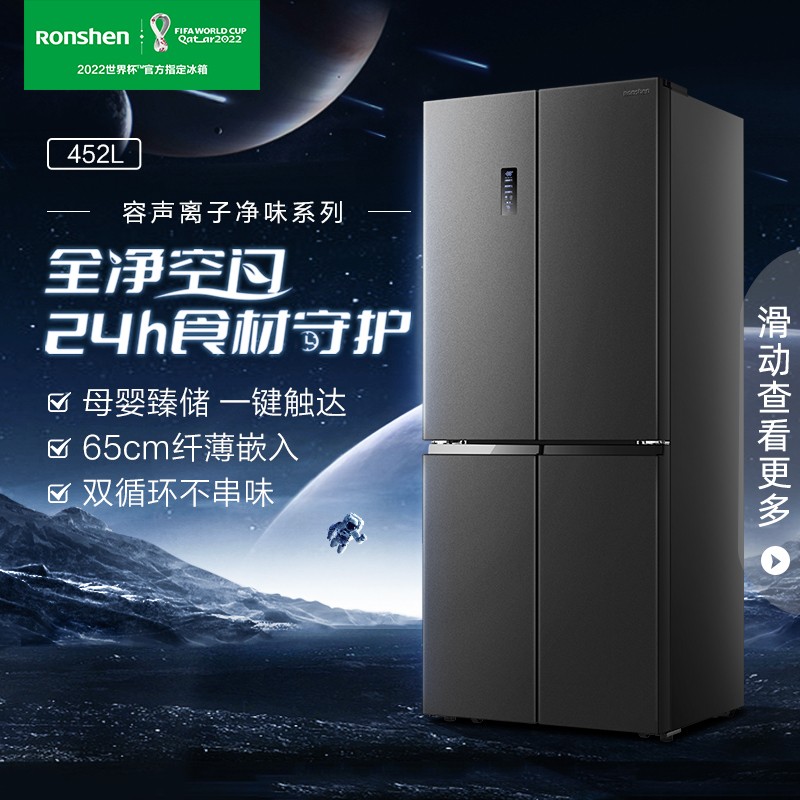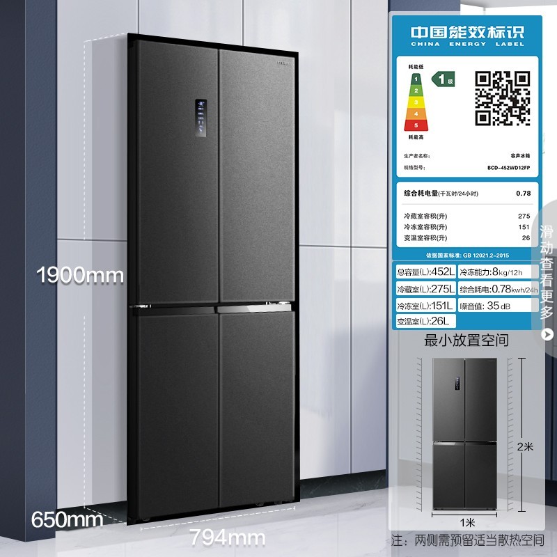 容声 离子净味系列 BCD-452WD12FP 风冷十字对开门冰箱,总容量为452L,其中冷藏室299L,冷冻室153L,含门厚度仅为650mm,轻松嵌入柜体。采用全时双驱变频,矢量双变频压缩机搭配一体式离心风机,控温更加精准,综合耗电量仅为0.78kwh,冷冻能力高达8kg/12h,实现-25℃深冷速冻。采用双循环系统,冷冻冷藏各有一套冷凝器,减少食材的串味和冷凝效应。冷冻、冷藏室均搭载抗菌除味系统,冷藏风道内置钯银离子除菌,还可以除乙烯,冷冻采用铜离子快速分解细菌,高效除味。多层微孔出风,利用化霜水汽增加冷藏室湿度,果蔬可以保持一周水润。冷藏室设置蓝光,延长果蔬光合作用,持续保持鲜活状态。