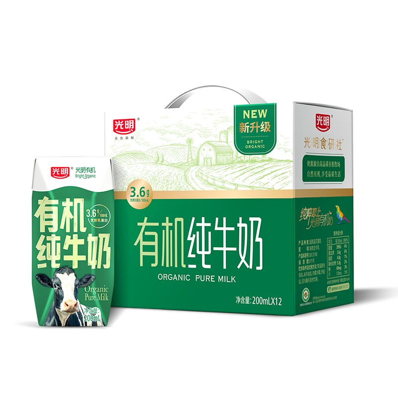 光明是中国领先的高端乳品引领者。公司拥有世界一流的乳品研究院、乳品加工设备以及先进的乳品加工工艺, 主营产品包括新鲜牛奶、新鲜酸奶、乳酸菌饮品、常温牛奶、常温酸奶、奶粉、奶酪、黄油等多个品类。此款光明有机纯牛奶源自光明安心牧场,用科学化的高标准管理保障每一滴牛奶的品质,3.6g优质蛋白乳,120mg原生高钙奶,全程有机,品质更安全。规格:200mL*12盒。