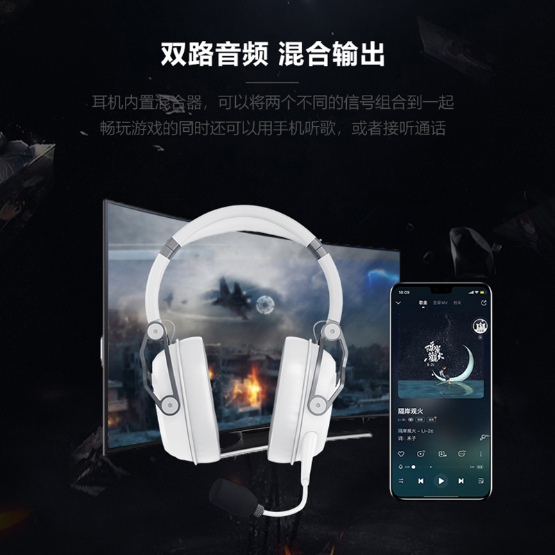 耳机采用厚壁塑料、铝饺链和柔性弹簧钢材质的结构设计,精湛的加工工艺。耳机内置混合器,可以将两个不同的信号组合到一起畅玩游戏的同时还可以用手机听歌,或者接听通话。