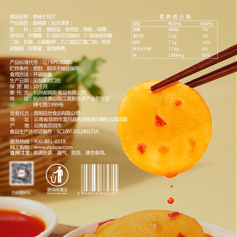 百草味(Be&Cheery)推出的这款香辣土豆片,选用土豆、食用盐、辣椒、植物油等配料制成,每100g中含蛋白质1.3g,脂肪7.1g。土豆红润油亮,口感粉糯。适合朋友聚会、家庭野餐、看剧观影等场合食用。独立小包装,开袋即食。保质期为10个月,建议在密封、阴凉、干燥的条件下存放。