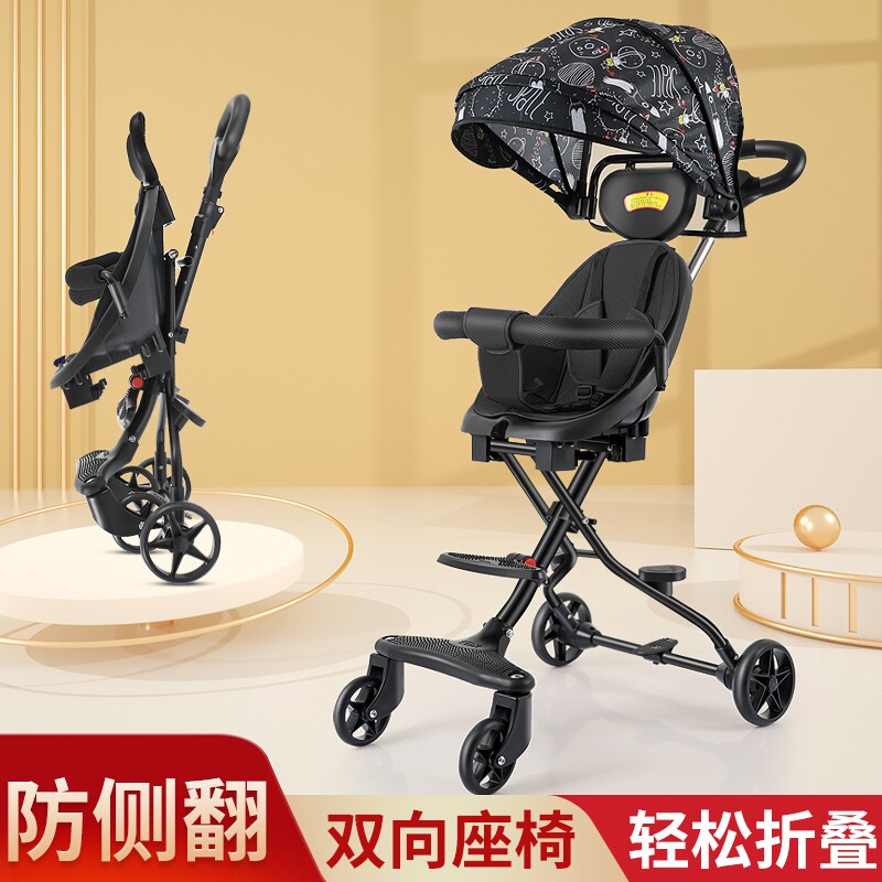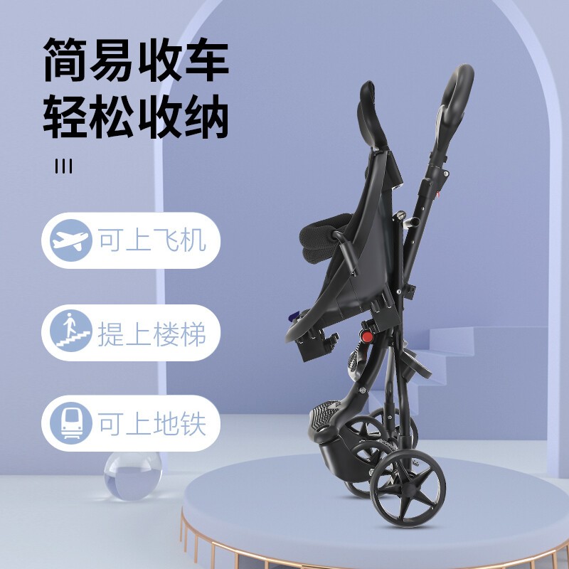 双向推行,适应宝宝小情绪,亲密互动每一刻,快速折叠携带方便,轻松提上楼梯,出行省心吗,加高靠背,呵护稚嫩小脊椎,可打开安全护栏,方便上下车,全方位保护,防止坠车。