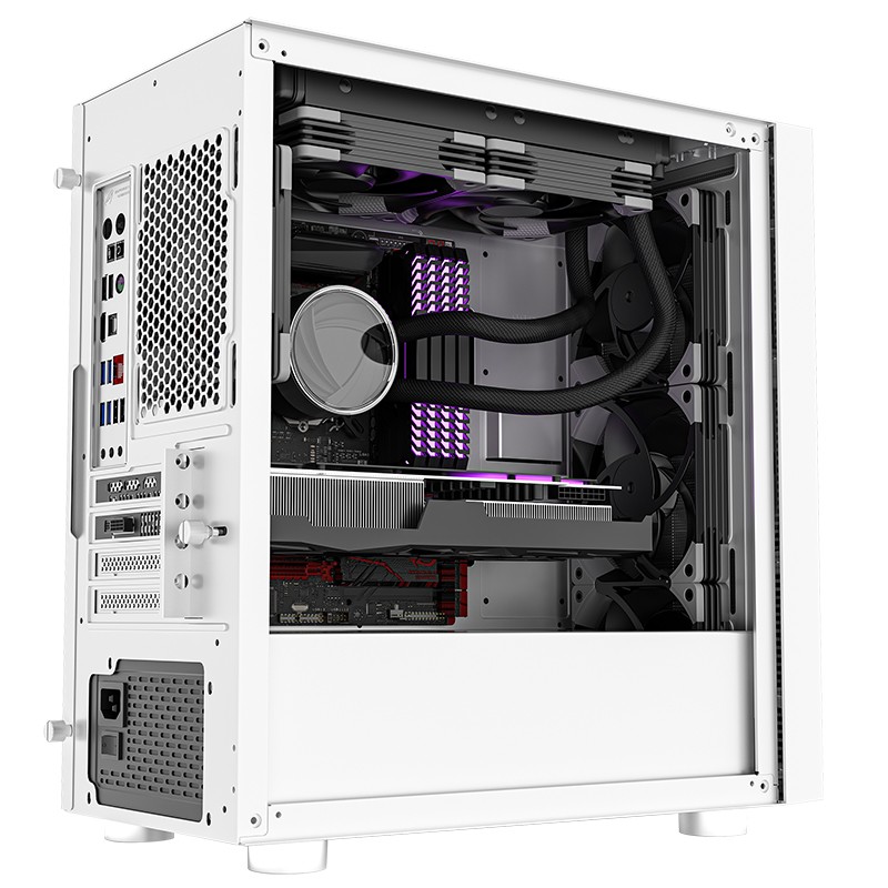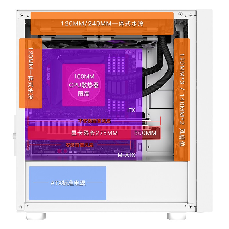 支持300MM长度以内显卡,M-ATX/ITX主板,桌面静音小箱,游戏办公两不误。 顶部支持240水冷,后半支持120水冷,开合式面板设计,4Pcs显卡挡片,散热器限高160mm,208mm宽体机箱。3.0USB高速传输,高清音频,耳麦。