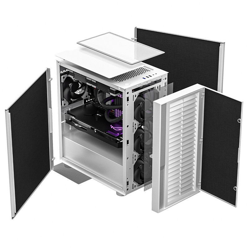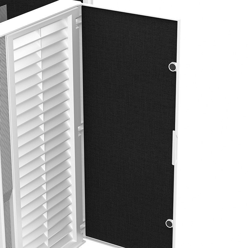 标配三只可水洗防尘网,可水洗,易清洁。顶盖可替换静音盖,内侧隔音棉锁住噪音,有效安静办公。高性能顶盖,轻质网状织物既可以让热量排走,又能阻挡灰尘。磁吸顶盖可替换成防吸尘网,可水洗。电源仓下方对防尘网可有效保护电源。 四面环绕降噪棉,主动静音。最多安装六只风扇,组建短吹风道。办公、游戏双重选择。