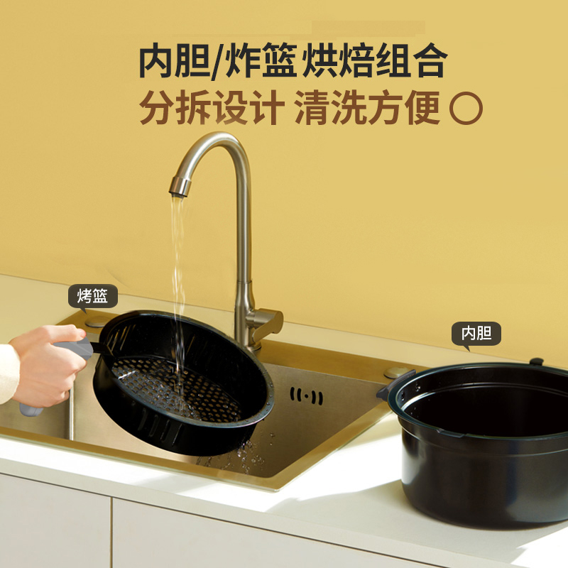 利仁(LIVEN)这款型号为KZ-J5000B的空气炸锅,内筒容量为5升,加热功率1100W,最高加热温度可达210℃,搭配循环热风,可食材自身被逼出的多余油脂达到油炸效果,有效降脂去油,同时锁住食材水分和营养;炸蓝侧壁采用立体导风槽设计,锅底凸型热风回流全面,食材均衡受热,不烤焦夹生,确保酥脆可口;透明玻璃上盖,可随时关注烹饪情况,定时/温度独立按钮90℃-210℃随心控。