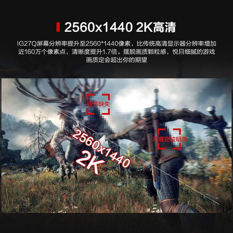 IG27Q 采用IPS面板,外边框仅1.8mm,窄边框设计。屏幕分辨率提升至2560*1440像素,比传统高清显示器分辨率增加近160万个像素点,清晰度提升1.7倍。配备 DD Driver芯片,拥有144Hz刷新率,重新优化了面板算法,将响应时间提高到1ms灰阶响应速度。配备高色域背光方案,NTSC色域覆盖率达到85%,110%SRGB色域。支持采用DC调光,过滤蓝光。 预设了FPS/RTS游戏显示模式,进入对应类型的游戏后,玩家只需通过快捷键选择,即可得到适用于该游戏的对应画质。搭载Freesync技术能够将显示器的刷新率和显卡的帧速率进行同步,大限度地缩短输入延迟,并减少或消除玩游戏和播放视频期间产生的卡顿,花屏和撕裂问题。 配备有HDMI、DP信号输入接口,方便 KBOX ONE、PS4、电视盒、游戏本等设备的接入。