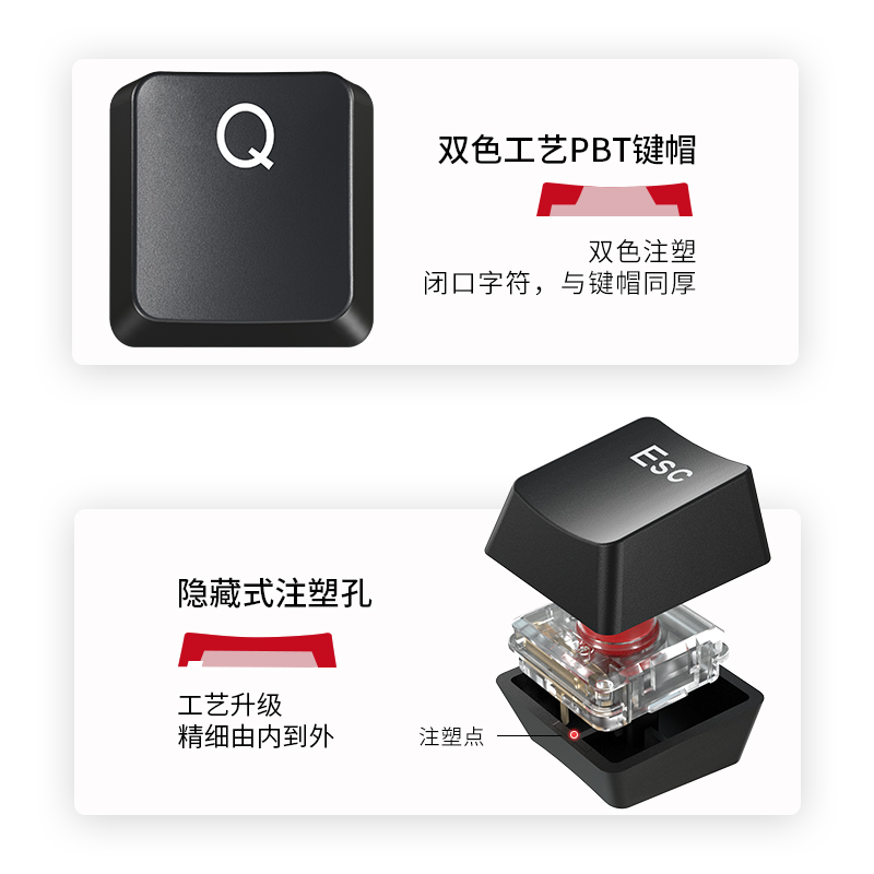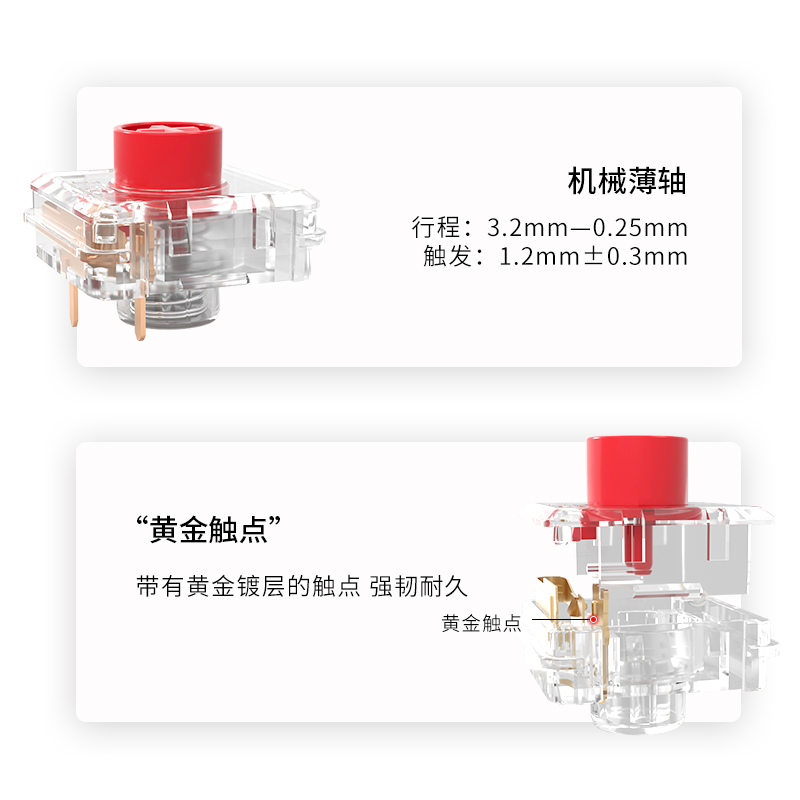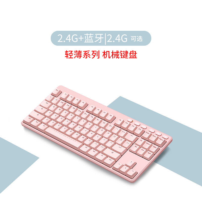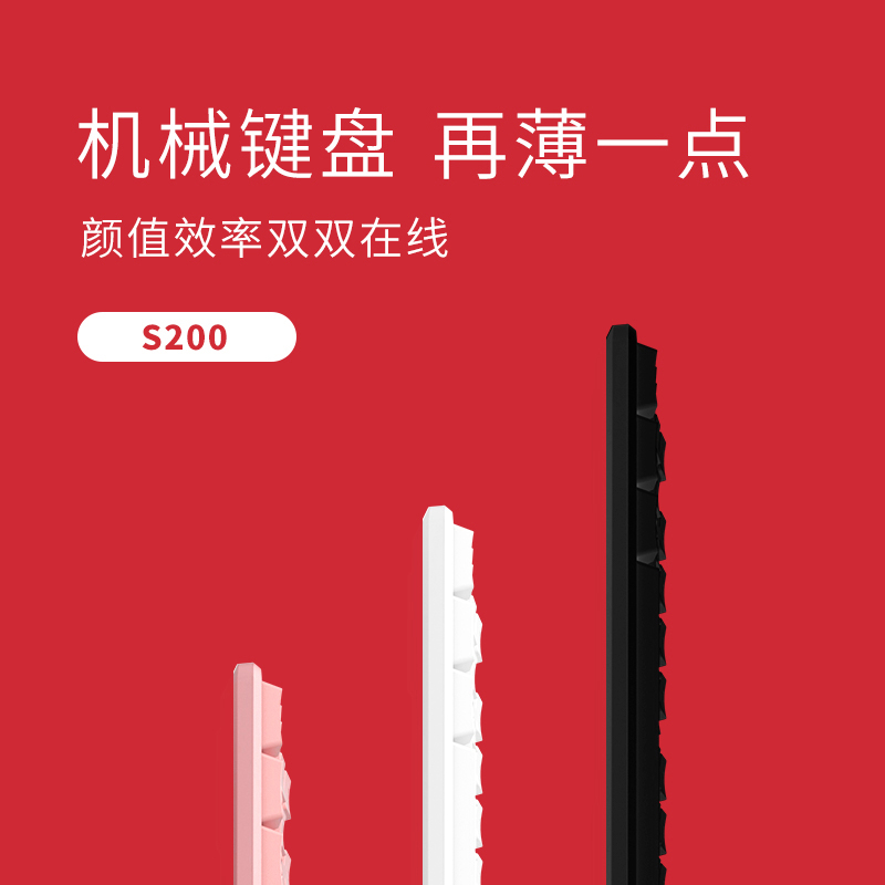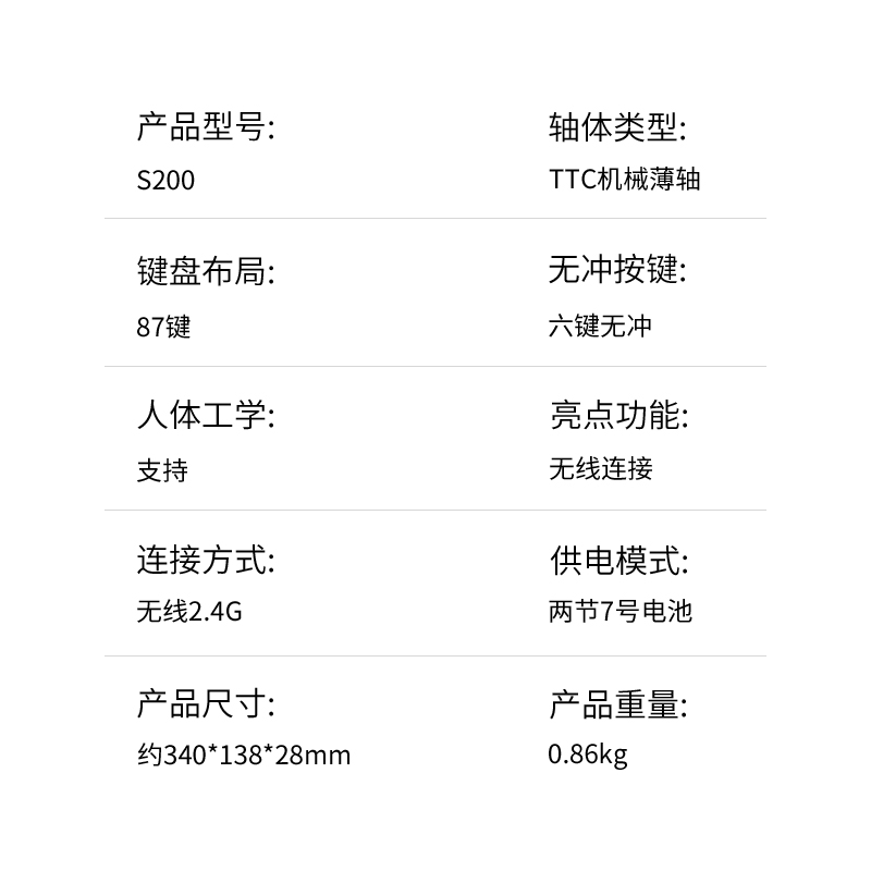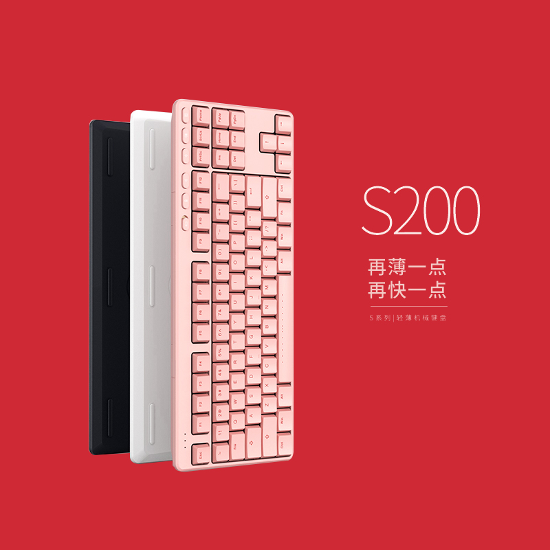 ikbc S200 机械键盘,87键布局,采用国产TTC矮红轴,总行程3.2-0.25mm,触发压力45±10f,触发行程1.2±0.3mm,轻薄处低至1.3cm。双色注塑PBT键帽,提供独立的多媒体热键。使用两节7号电池,官方宣称续航可达6个月以上。尺寸:340*128*25mm,重量749g。
