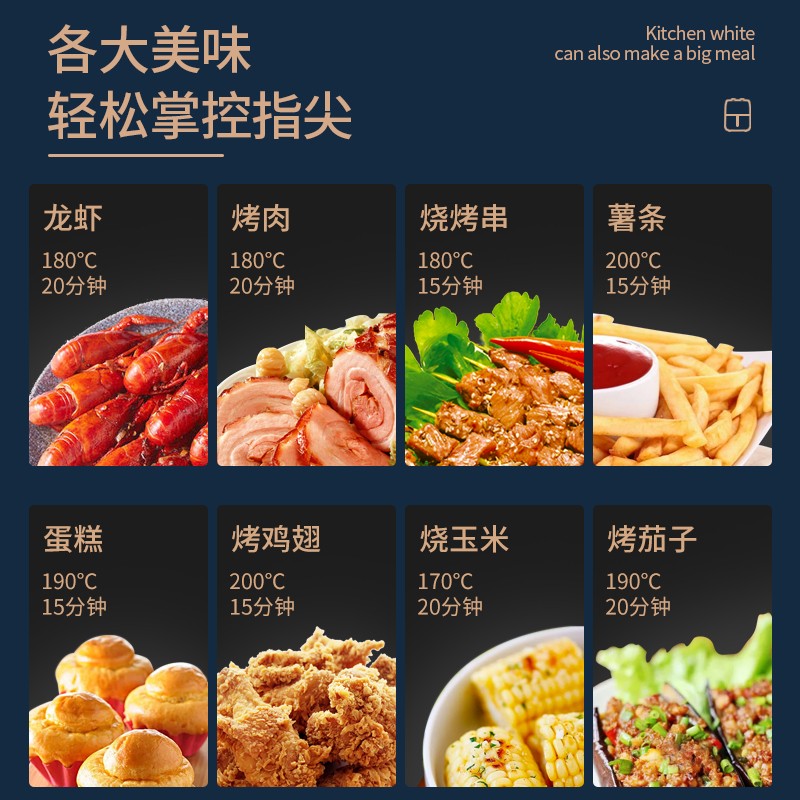4L黄金容量,美味全家共享。玻璃触控面板,美食就在弹指间。抽拉式炸篮,断电安全防护。在烤制过程中抽取拉篮,自动断电,在放入烤篮继续按原先的状态工作。