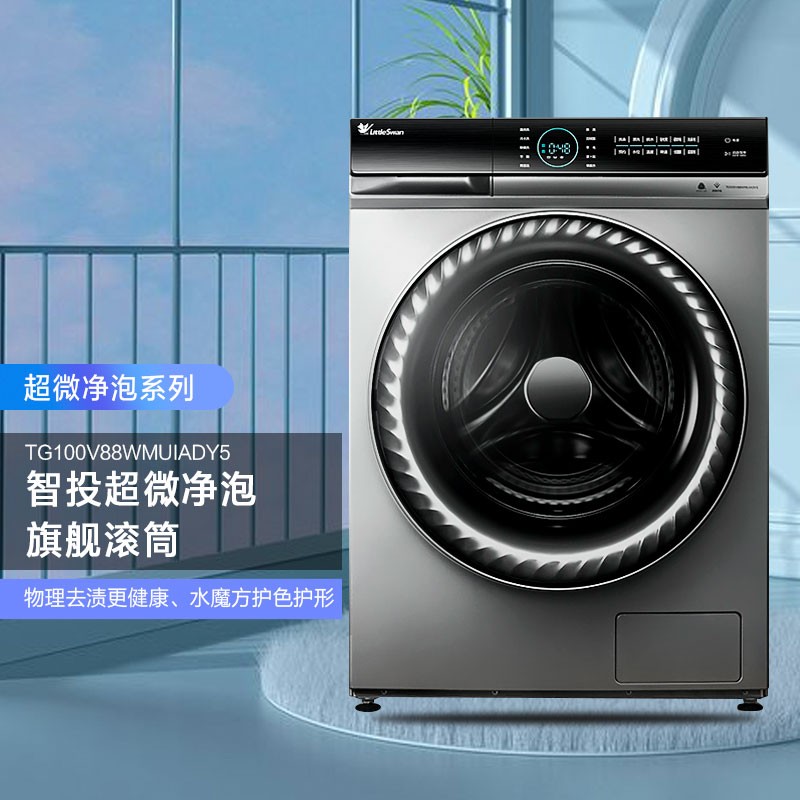 小天鹅 水魔方系列 TG100V88WMUIADY5 滚筒洗衣机,搭载有最高转速1400转/分钟的BLDC变频电机,配合可深入衣物内部的“超微净泡洗”,实现高效去污洗涤,洗净比高达1.08。水魔方冷水洗程序,让澎湃洗涤水流,强力穿透衣物,达到了揉搓的效果,冷水护色的同时保证洗涤效果,银离子健康除菌。具备有类似于“I-Dos”的“I-Smart智投放”功能,可实现洗涤剂自动投放,且投放误差维持在±1毫升。