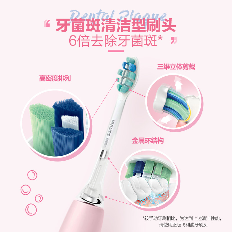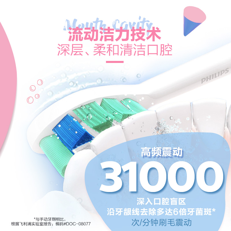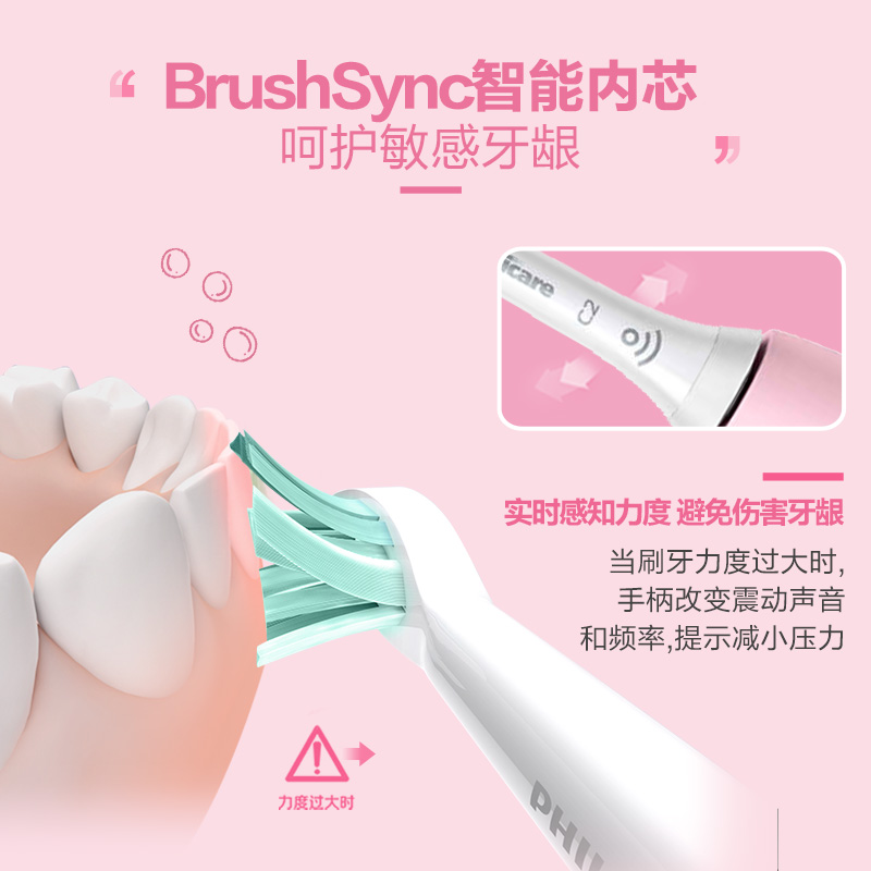 这款HX6806/02电动牙刷是飞利浦的新款入门型号,定位介于老款6511和6730之间,依然采用了可产生31000次/分的磁悬浮马达,声波振动可产生流动清洁力,通过按钮可在两种振动强度中切换。与上一代入门级电动牙刷最大的区别在于加入了智能力度感应,太过用力时会降低振动幅度提醒,有效保护牙齿不过度清洁,并且牙刷手柄加入了BrushSync™技术, 如果使用与支持此技术的新一代刷头,可根据个人刷牙时间、力度来计算何时应该更换刷头,并有指示灯及嗡鸣音提醒。