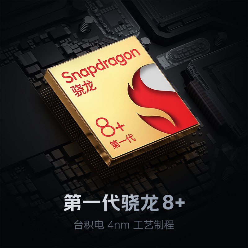 正面采用一块6.78英寸三星E5柔性AMOLED直屏,2400*1080分辨率,120Hz刷新率(支持应用自定义高刷),全局1000nit最高亮度,局部1500nit峰值亮度,100%DCI-P3色域,JNCD≈0.28,△E≈0.32,支持DC调光。搭载第一代骁龙8+处理器,采用4nm台积电工艺制程,由1超3大4小的核心组合配置,超级大核主频高达3.2GHz,3颗大核主频为2.75GHz。搭载超频版UFS3.1 闪存以及增强版LPDDR5运行内存,散热方面,内置3930mm2的动力泵VC液冷散热板,能快速带走热量,贴合式立体石墨层进一步加热量传导,同时采用的低温感航空铝中框搭配内部的十颗温度传感器以及自研低温感智能散热系统,让散热更加高效,120W+4700mAh电池续航方案。