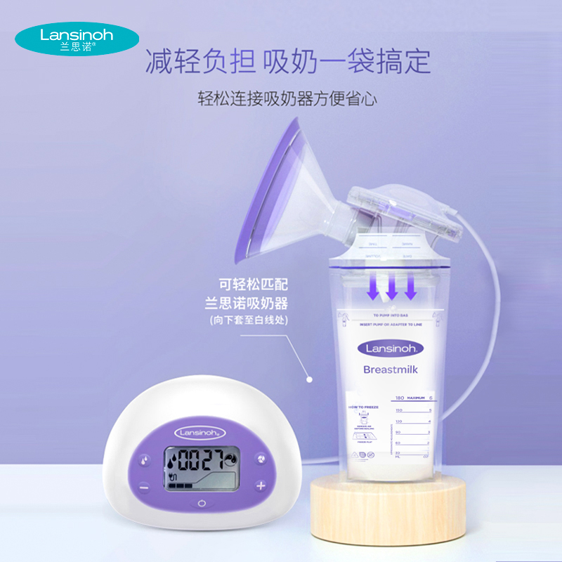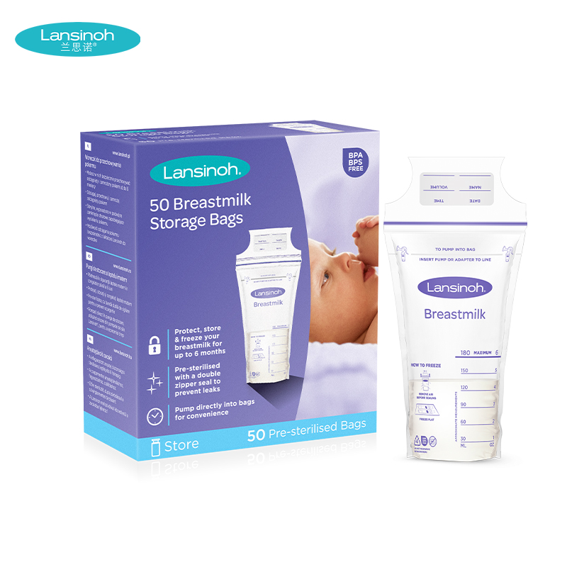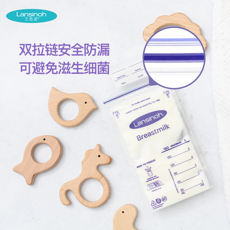 Lansinoh是美国知名的母婴用品生产商,是国际母乳协会推荐品牌。这款Breastmilk Storage Bags母乳储存袋专为处于哺乳期阶段奶水多或工作较忙的妈妈们设计,袋身采用医药级无菌材质制成,安全无毒(不含BPA),变色双拉链封口设计确保完全密封;外侧设有容量标示,袋容量为180毫升(实际储存量更高),空白区域可直接填写日期时间。使用方法:将母乳直接挤入或倒入袋内,将空气挤出,沿封口按压完全封闭后擦干袋身平躺放入冰箱冷藏。
