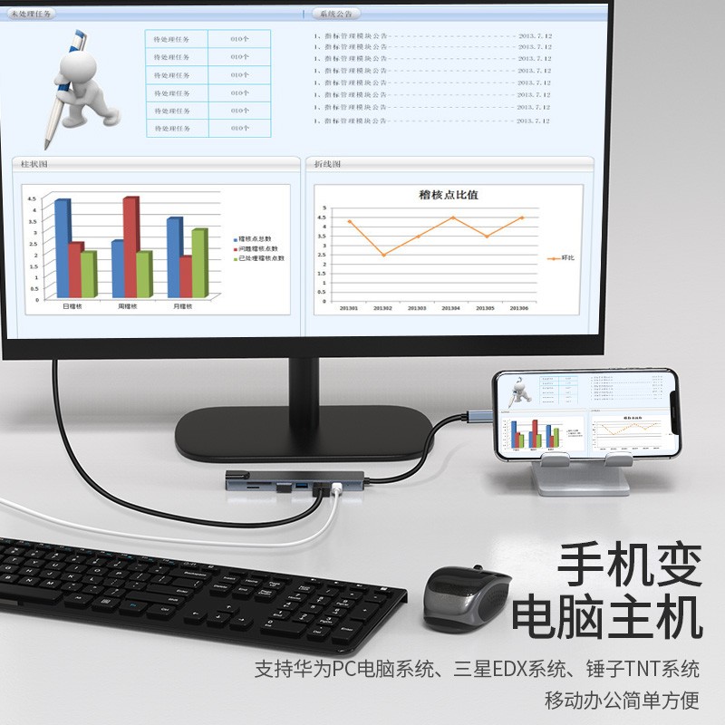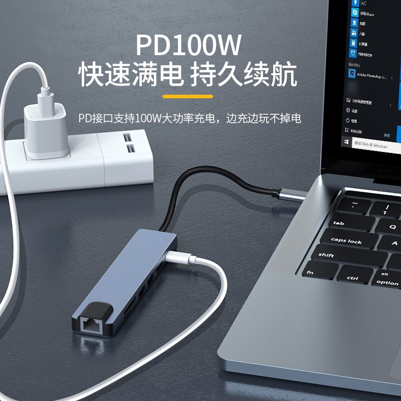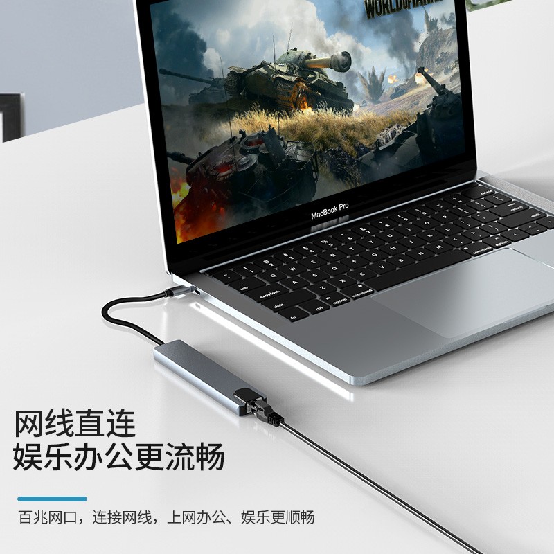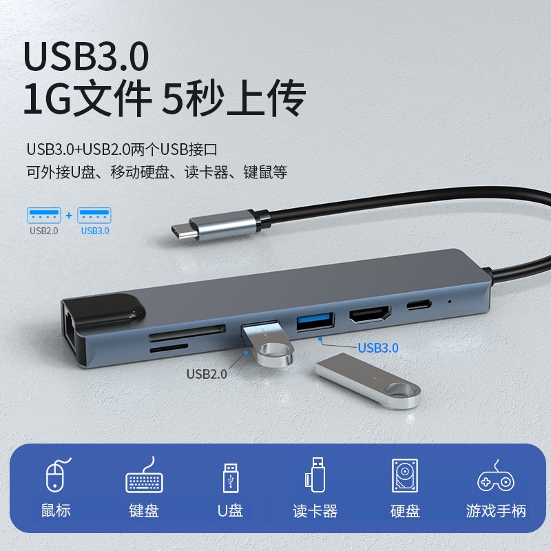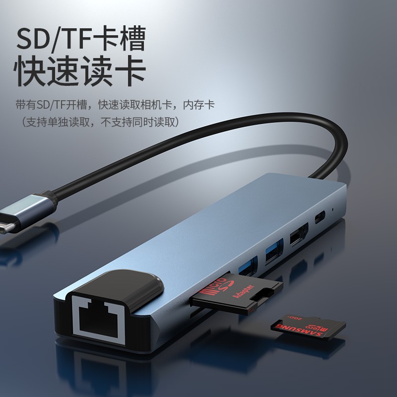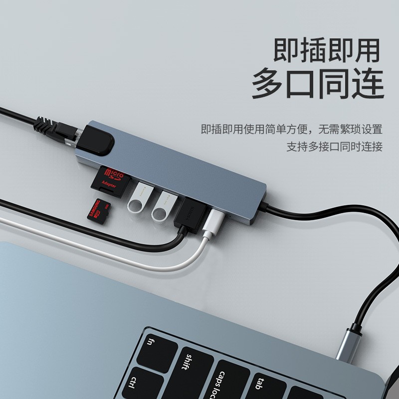 Type-C扩展坞7合1,支持TF和SD快速读卡,USB2.0+USB3.0两个USB接口,可外接U盘、移动硬盘、读卡器、键鼠等,PD接口支持100W大功率充电,HDMI支持4K高清分辨率,百兆网口,网线直连娱乐办公更流畅,即插即用,多口同连,支持多接口同时连接,合金外壳,散热性佳,产品体积小巧,出行携带方便。