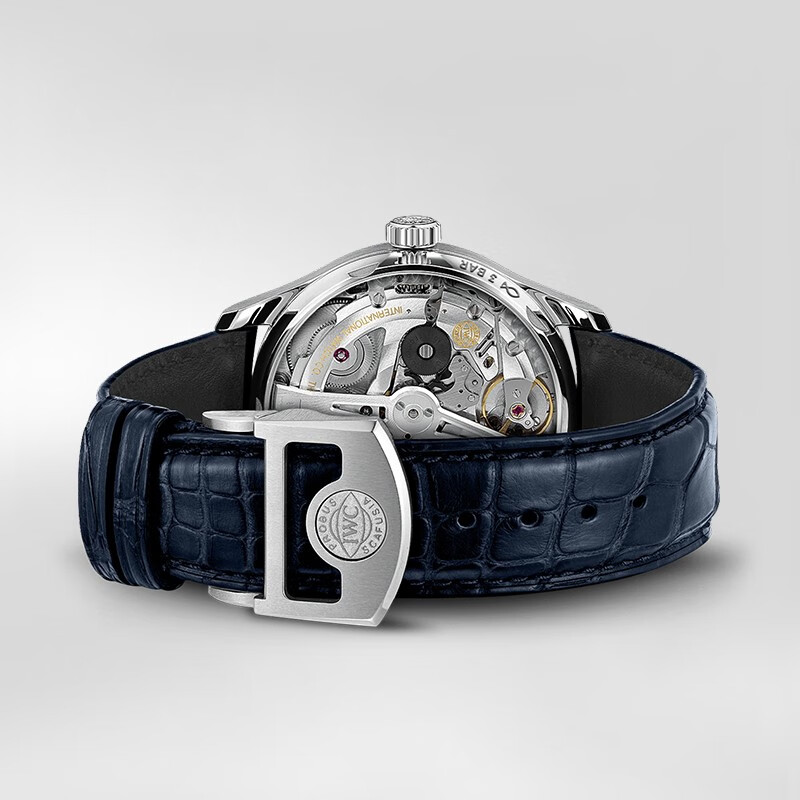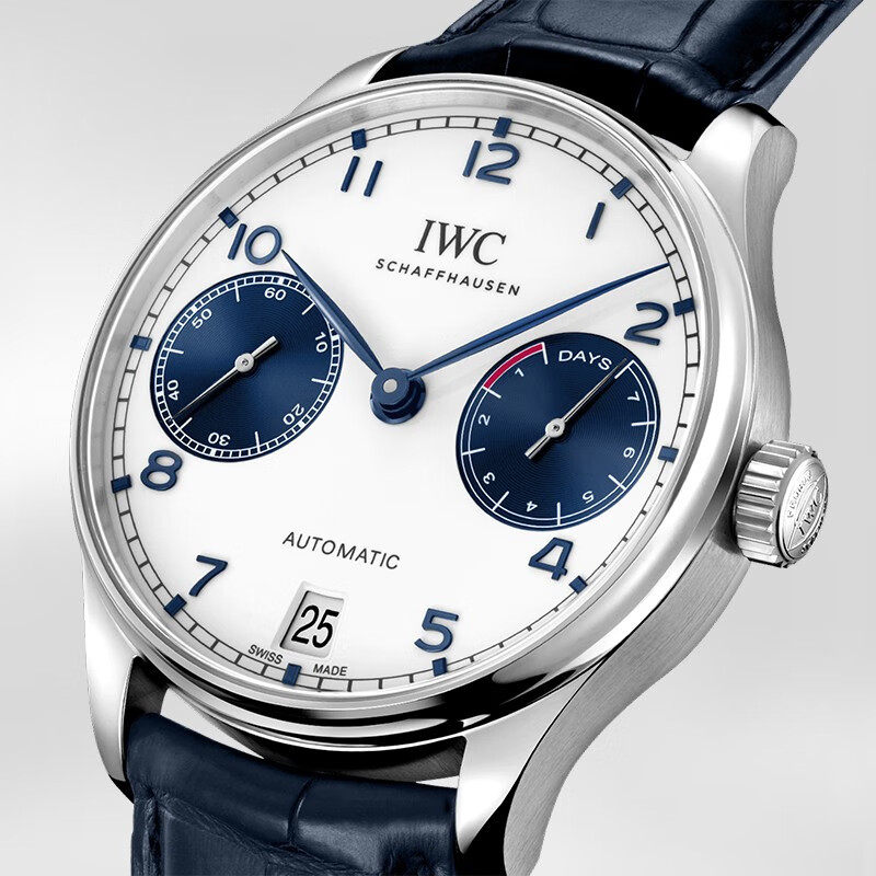 WC万国表为其葡萄牙系列再添新作,此款采用白、蓝双色表盘,呈现反差之美。抛光漆面白色表盘搭配夜蓝色小表盘,颇具航海气息和现代风尚,同样彰显出IWC葡萄牙系列诞生之初的灵感源于航海。蓝色鳄鱼皮表带搭配折叠表扣,尽显隽永优雅。经典设计,精钢表壳搭配白、蓝双色表盘,蓝钢柳叶形指针,经典的轨道式分钟刻度,搭载52010型自制机芯,比勒顿自动上链系统,7日动力储备,精美背透,机芯一览无余,蓝色鳄鱼皮表带,折叠式表扣。