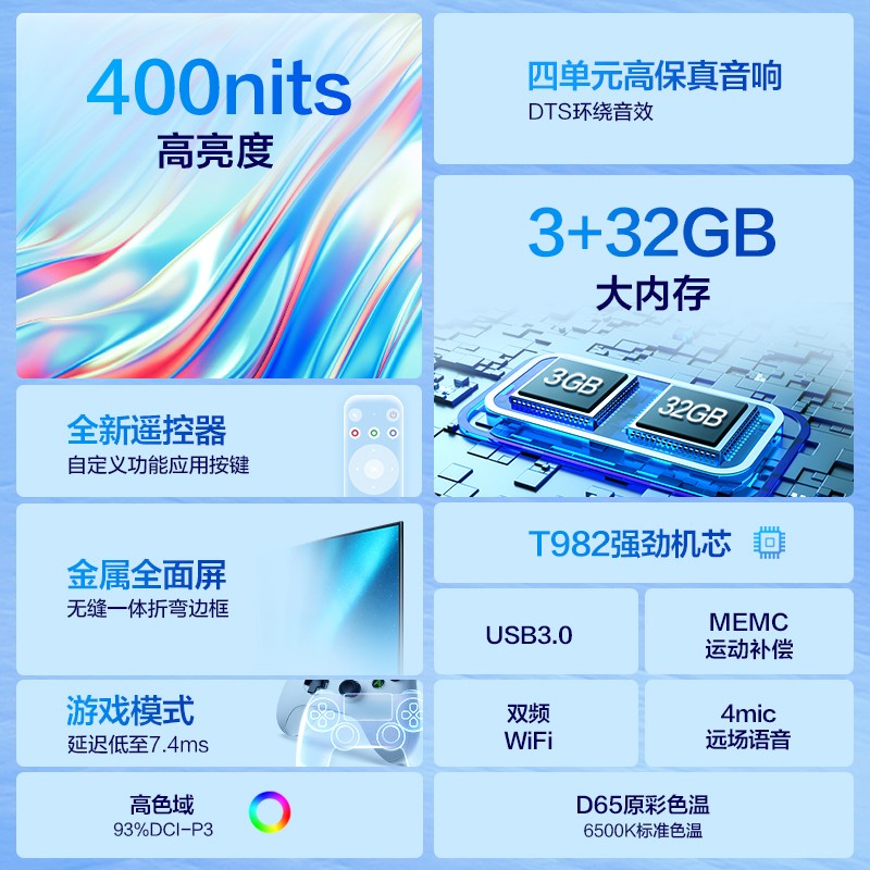 雷鸟 鹏6SE系列 S365C 液晶电视,内置游戏模式,开启后支持120Hz刷新率,以及VRR可变刷新率、ALLM自动低延迟,输入延迟低至7.4ms,游戏画面流畅更跟手。支持MEMC动态补偿,高度动态画面无拖影更清晰。实现90%的DCI-P3色域覆盖,以及D65色温调校,色彩表现更丰富更真实。搭载12nm的T982新品,支持8K视频解码,配合2GB内存+32GB闪存组合,流畅运行更多APP,支持HDR10视频和Dolby&DTS音频解码,本地视频播放兼容性更强。支持双频WiFi、USB3.0,观看4K高清视频加载更顺畅。