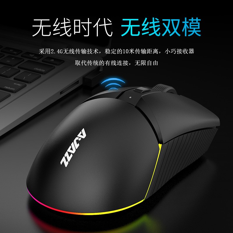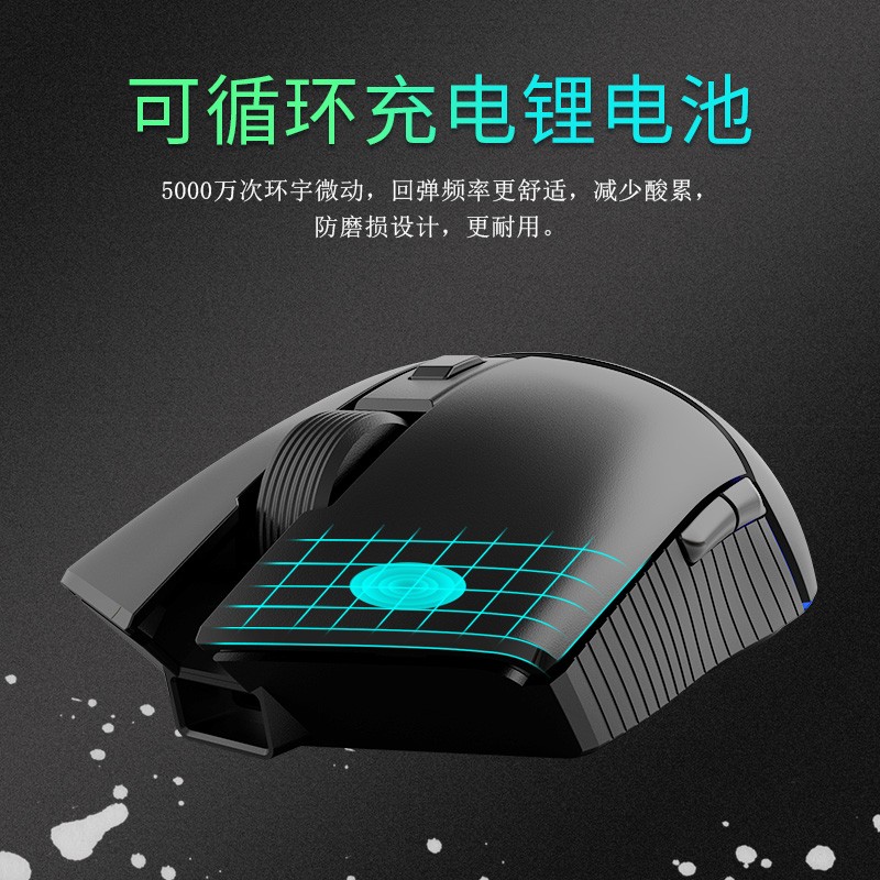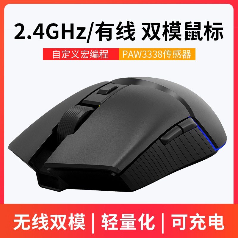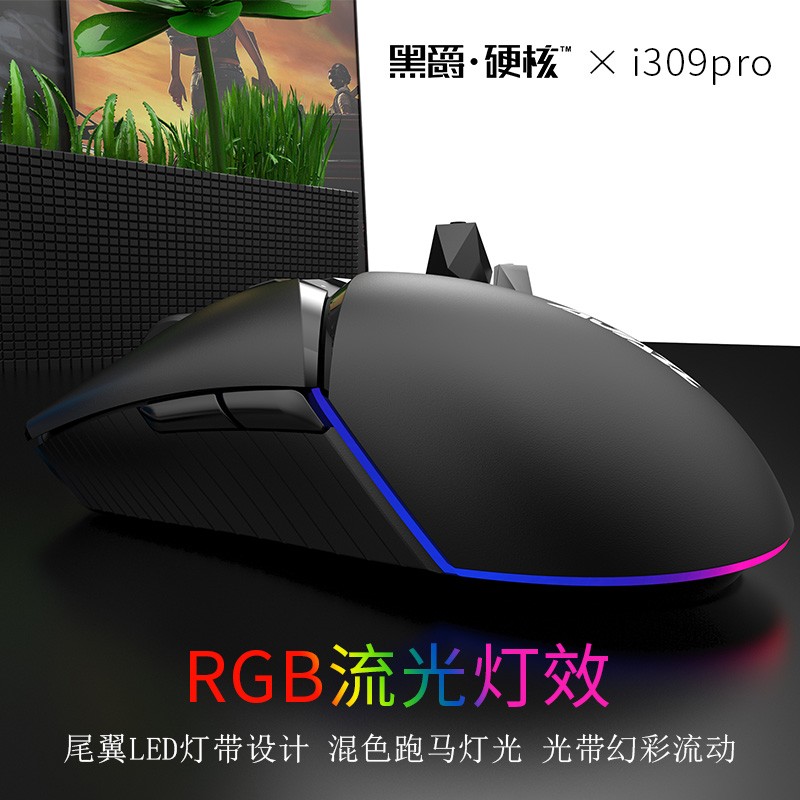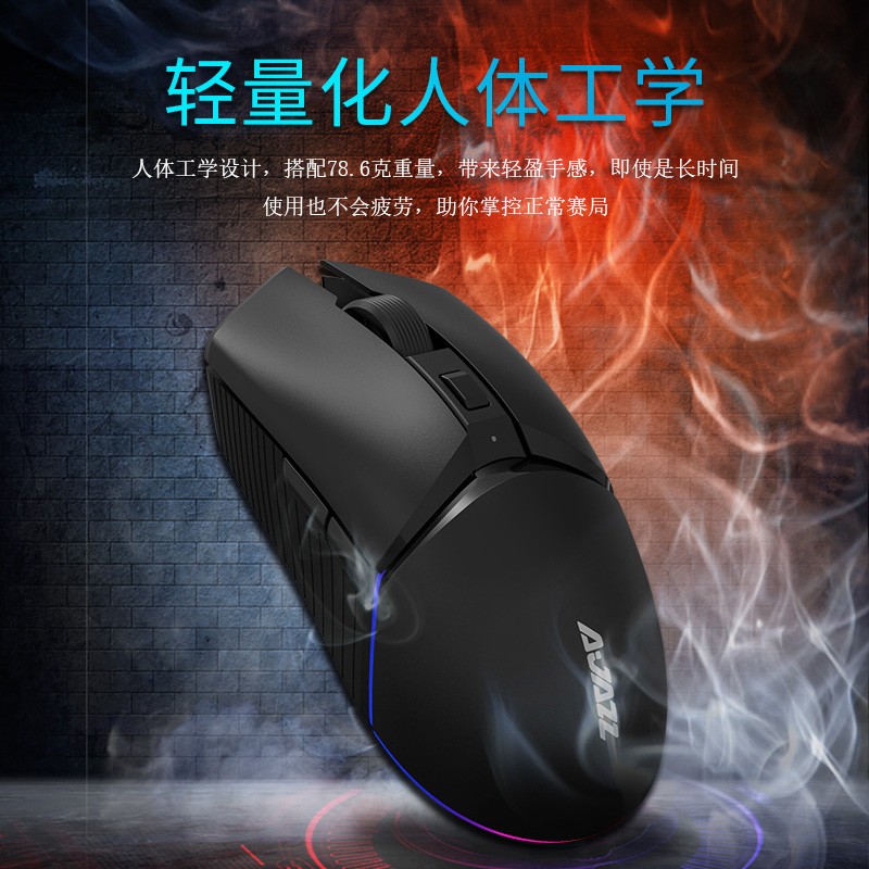 i309pro是一款左右对称外形的鼠标,这就说明左右手操作均可,中间横截面设计区分了腕托及左右键的布局,有点新意。正面采用了4键布局,左右键、滚轮、DPI的常规设计。腕托的Ajazz为热印设计,非发光。