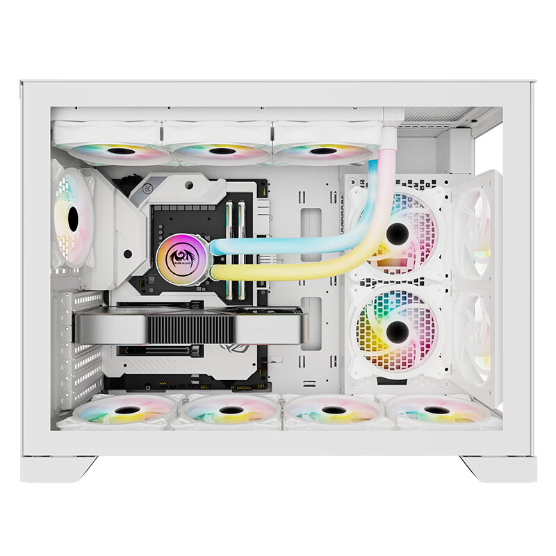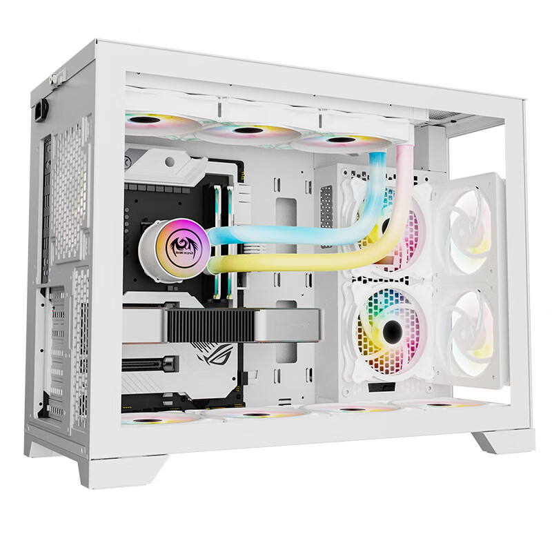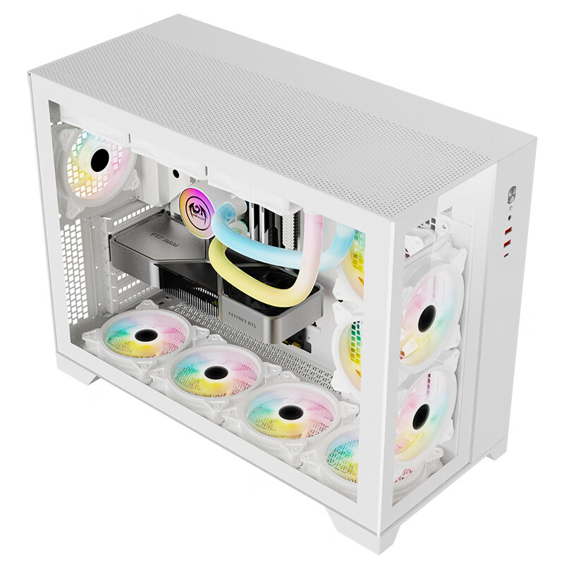 机箱左侧全景玻璃侧透,前面板玻璃板,顶部一体化防尘孔,防尘散热,底部尼龙防尘网,黑边白面,高端防尘,开机键CD纹,精致金属质感,显卡安装模块可旋转设计,支持横插与竖插显卡。机箱显卡限长340mm,兼容市售主流显卡,CPU风冷散热器限高180mm,机箱支持E-ATX、ATX、Micro-ATX、Mini-ITX等主板,机箱硬盘架三个,支持3.5英寸X1,2.5英寸X2,机箱支持最多安装十三个风扇,机箱支持水冷安装,大空间设计,页板位支持水冷:480mm/420mm,后板位::120mm,机箱二合一音频接口,两个USB3.0接口,配置USB3.2 Gen2 Type-C接口。