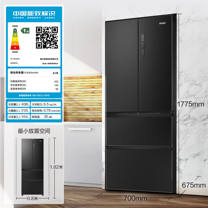 海尔(Haier)这款型号为BCD-408WBPBU1的冰箱总容积408L,冷藏室容积212L,冷冻室容积144L,变温室容积52L,其中变温空间支持三档温度调节,母婴模式通过4℃冷藏让母乳的DHA营养更充分稳定,独立密封抽屉,隔绝外界污染;此外还有零度模式、珍品模式。内置DEO净味健康净味系统,食材不易串味。99.9%抗菌面板,LED触控显示屏,机身宽度700mm。压缩机和风机双变频,综合耗电量0.78kW·h/24h,符合一级能效。支持手机WiFi智控。