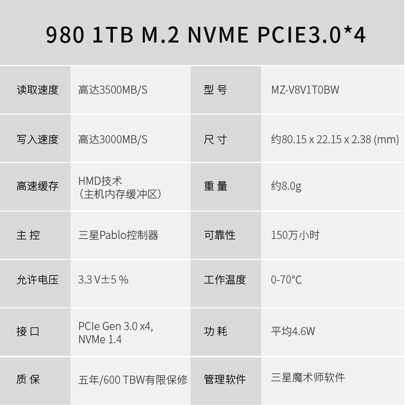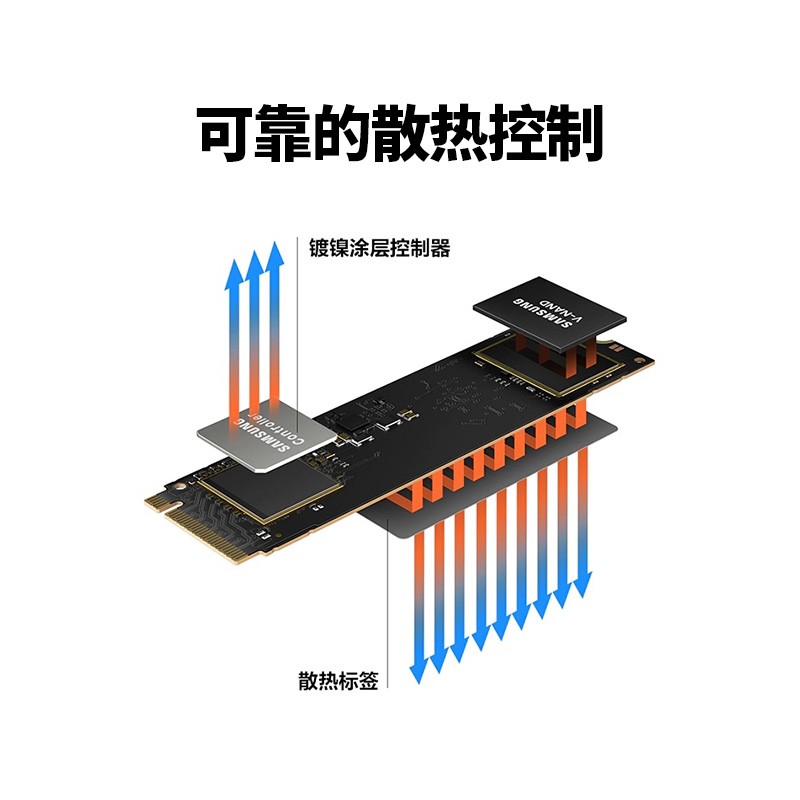 三星980 采用三星V-NAND 3-bit MLC闪存,无DRAM设计,其读取速度高达3500MB/s,写入读速也达到了3000MB/s。可全功率模式运行,为确保稳定的性能,980 采用镀镍涂层以提高控制器的散热效率,内嵌热控制算法,可自行管控发热。保修方面,980 支持5年有限保修或600TB有限保修。