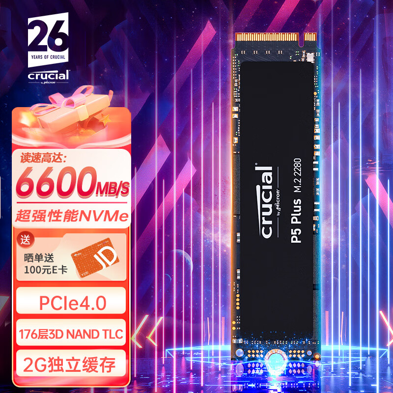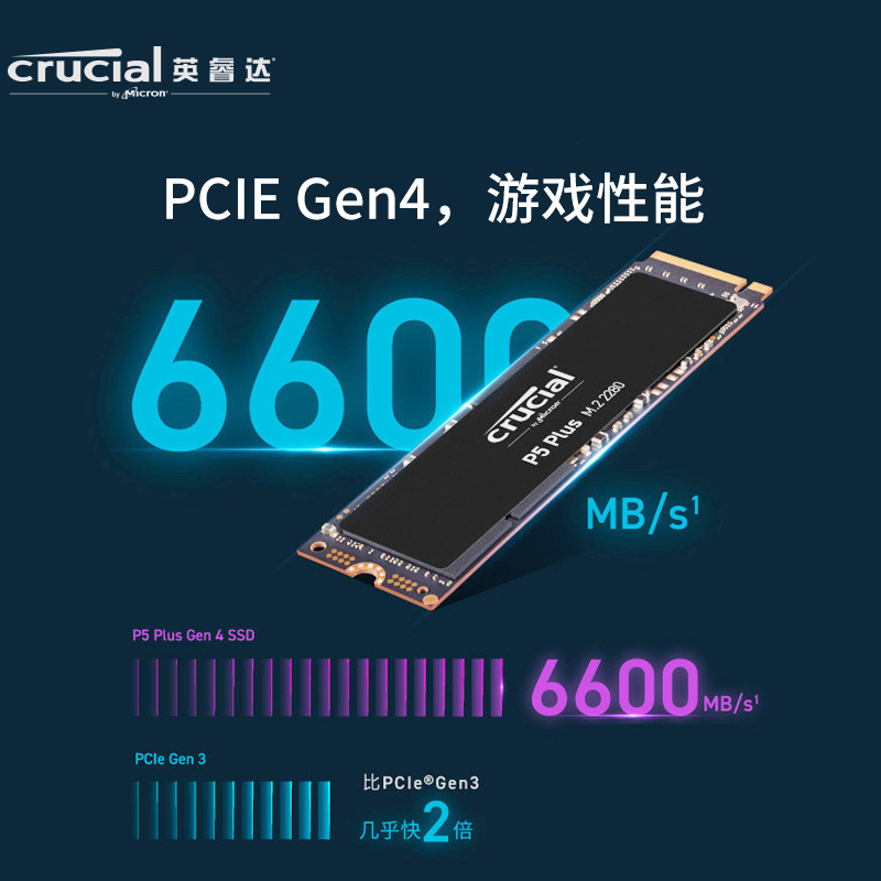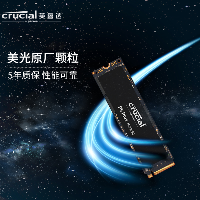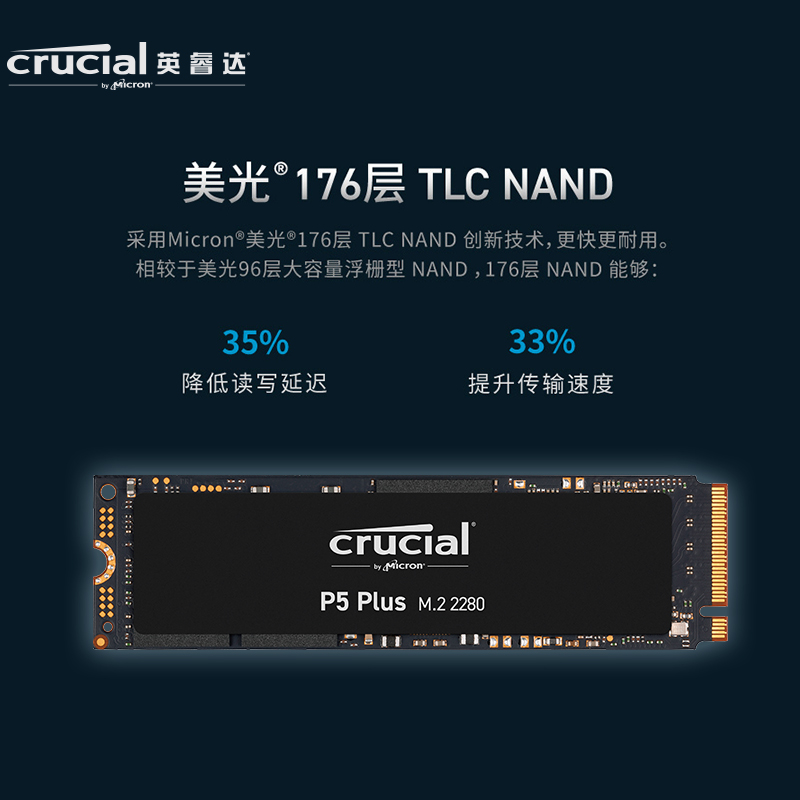 英睿达此款P5 Plus固态硬盘,采用镁光原厂1176层TLC NAND颗粒,拥有500GB、1TB、2TB容量可供选择,支持PCIe4.0协议,顺序读取速度高达6600MB/s,顺序写入速度5000MB/s,4K随机读取、写入分别为630K/700K IOPS,平均无故障时间超过200万小时,提供5年质保。