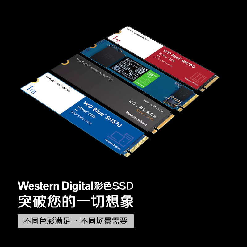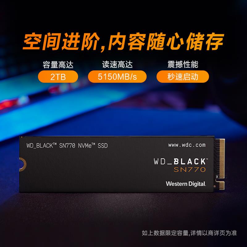 西数Black系列SN770固态硬盘采用M.2接口,2280规格,支持NVMe协议,支持PCle 4.0,搭配西部数据自研主控,高品质闪存,辅以Dram-|ess设计,支持HMB技术。让游戏内的反应速度更快,游戏体验更佳。专属定制游戏模式,实现性能优化,提升硬盘响应速度,随心畅快游戏。共有250GB、500GB、1TB和2TB版本,250GB版本顺序读写速度为4000MB/s,2000MB/s,寿命200TBW;500GB版本顺序读写速度为5000MB/s,4000MB/s,寿命300TBW;1TB版本顺序读写速度为5150MB/s,4900MB/s,寿命600TBW;2TB版本顺序读写速度为4850MB/s,4000MB/s,寿命1200TBW;质保时间5年。