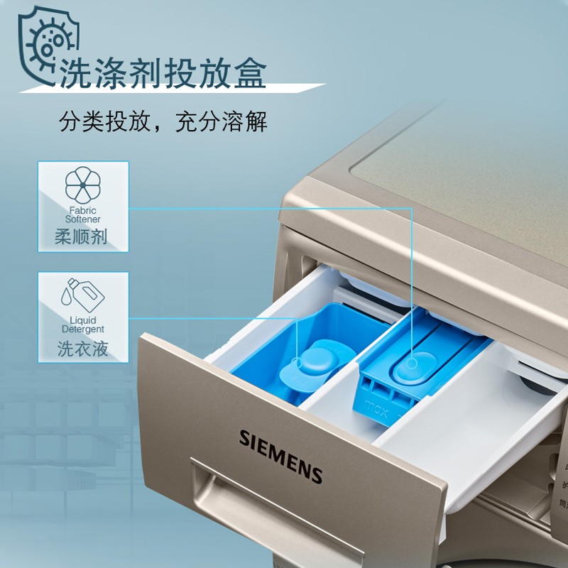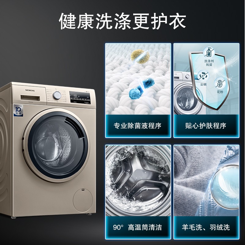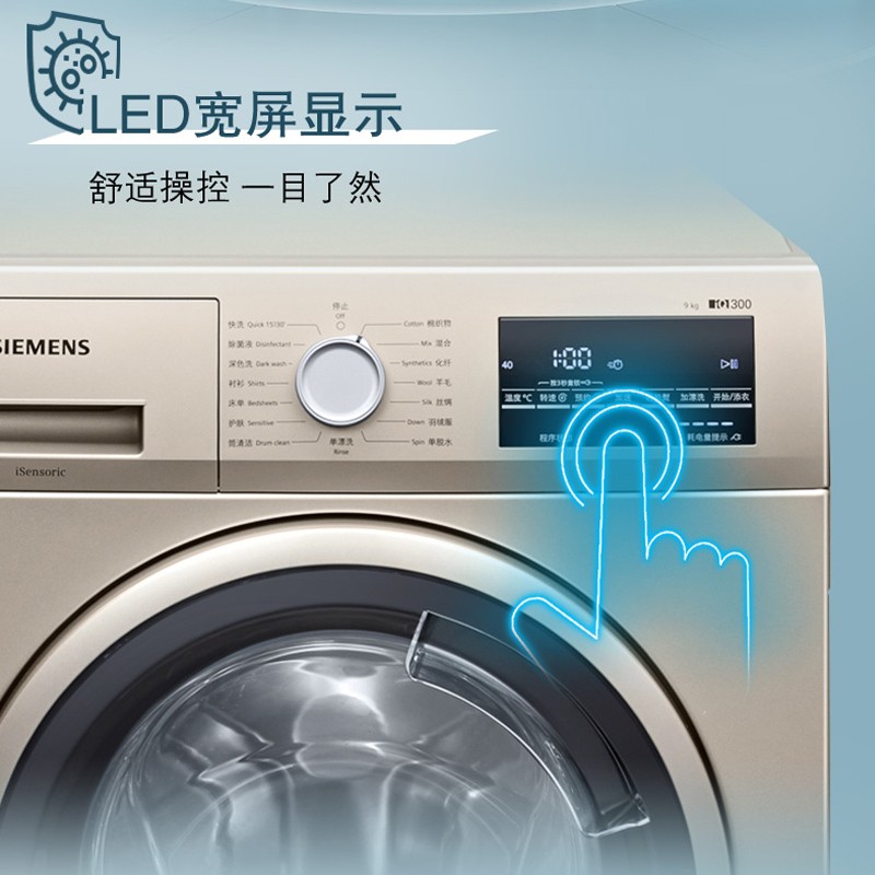 搭载BLDC变频电机,拥有9公斤大容量,采用470mm大门窗设计,内置99.99%除菌液程序、贴心护肤程序,另外还有深色洗、专业羽绒洗、轻柔羊毛洗等功能,搭载iSensoric智感系统,依靠内部多个高精度传感器,准确感知衣物重量,然后自动设置洗涤转速和温度,另外还支持高温筒自洁。