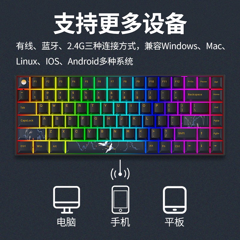 新贵 GM840Pro采用84键精简布局,紧凑合理优化的功能按键,保证实用性的前提下,节省桌面空间整体结构,简洁利落。三种连接模式支持无线蓝牙连接、USB有线连接、无线24G三模连接方式,支持多种设备使用,便于多设备无缝切换使用。