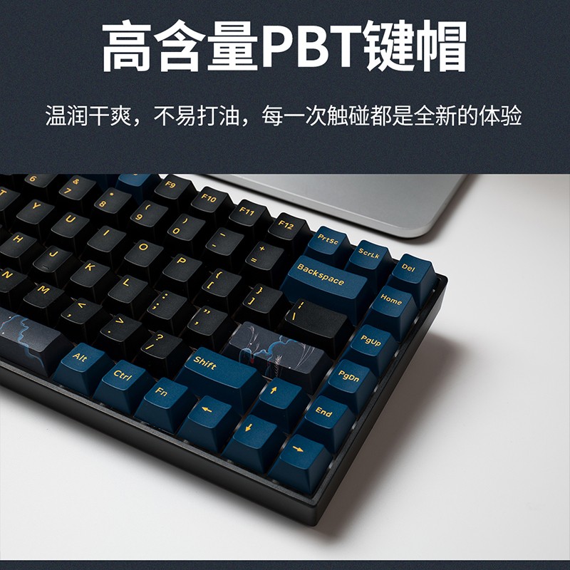 键帽采用原厂高度,与手指腹弧度相吻合的凹面弧型键帽,减轻敲击时指腹压力感,手感舒适、出众。键帽+采用双色热升华工艺,黑蓝配色,简约时尚,附赠四颗热升华键帽,提升产品个性。选用优质的定制机械轴体,触发响应迅速,回弹顺滑,有G黄PRO、G银PRO、BOX白、BOX红四种轴体,四种手感可选。