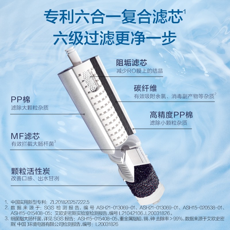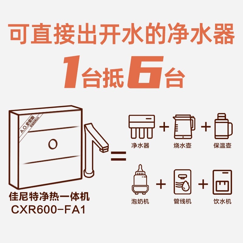 这款佳尼特 CAR600-FA1 反渗透净水机,通量为600G,热水出水量可达1.8L/min大流量,出水速度快,无需久等方便省时;内置2L真空热胆,先净化后加热,净化加热2合1,净水烧开沸腾后恒温保存,想喝热水时即开即有,实现大流量热水体验;100℃沸腾真开水,满足泡茶、做饭等热水需求;空胆时自动补水,舱内水仅沸腾一次,无需担心千滚水,饮用更放心;内置专利MAX3.0长效RO膜,两端进水设计,流道更长,净化更彻底;由PP棉、MF滤芯、颗粒活性炭、阻垢滤芯、碳纤维、高精度PP棉组合而成的六合一复合滤芯,可有效滤除杂质、余氯、重金属、细菌等有害物质,并改善出水口感,保证你喝到的每一滴水都安全放心。