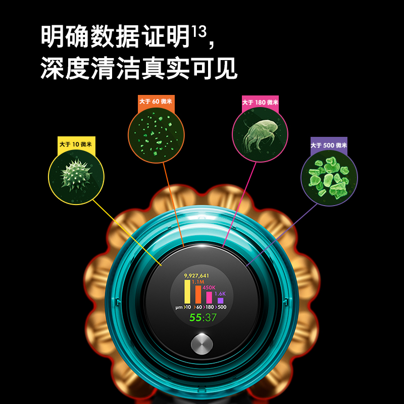 戴森于2021年4月推出V15系列,这款V15 detect total clean通过Hyperdymium旋速马达驱动可以产生230AW强劲吸力,14个同心气旋能够产生高达100000G的强劲离心力;支持激光探测,能够及时发现并解决微尘威胁,并且能够根据灰尘的大小及数量自动调节吸力,尾部的LCD屏可以实时分类显示吸入灰尘的数量及大小,并且对不同微小灰尘进行智能统计;整机采用5重HEPA过滤系统,主机重量1.93kg,配备2款主吸头+8款配件吸头,其中包括采用防缠绕技术的高扭矩吸头、能够探测并清洁硬质地面的激光软绒滚筒吸头、新设计的防缠绕螺旋形吸头等。