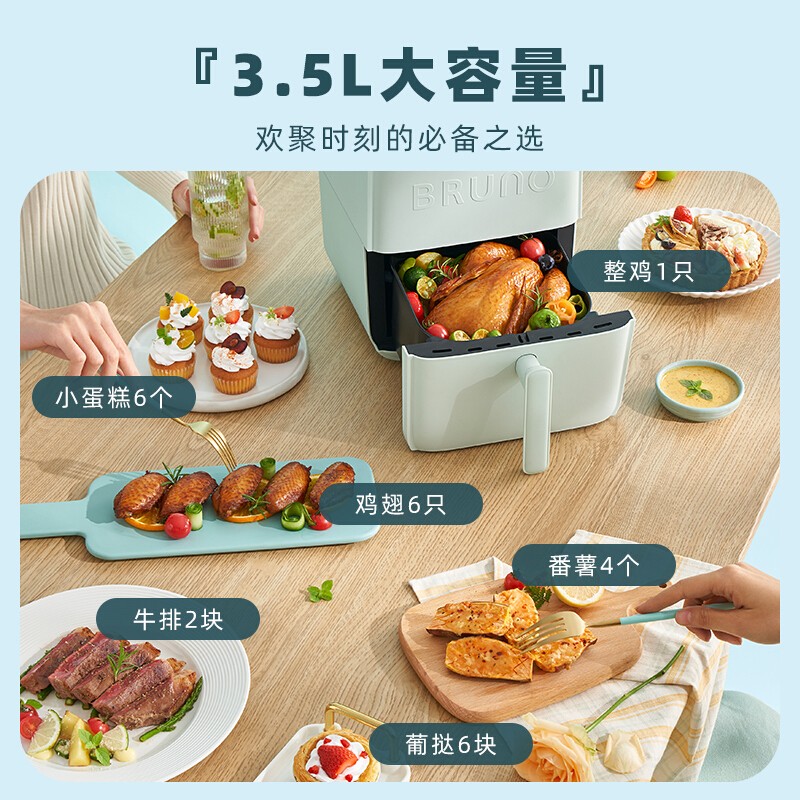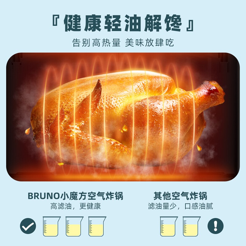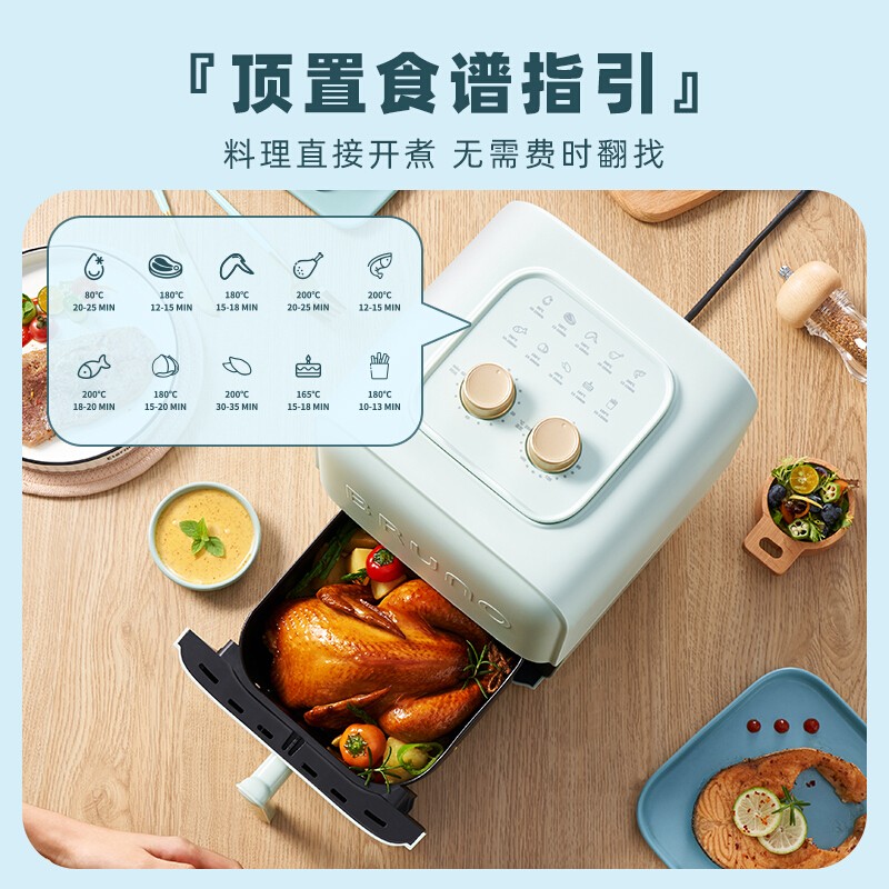 旋钮式菜单设计,自动定时控温,比你想得更简单。智能断电升级,取出炸篮即刻断电,推入后继续原程序工作, 可随时查看食物和加料调味,无需重新设置。