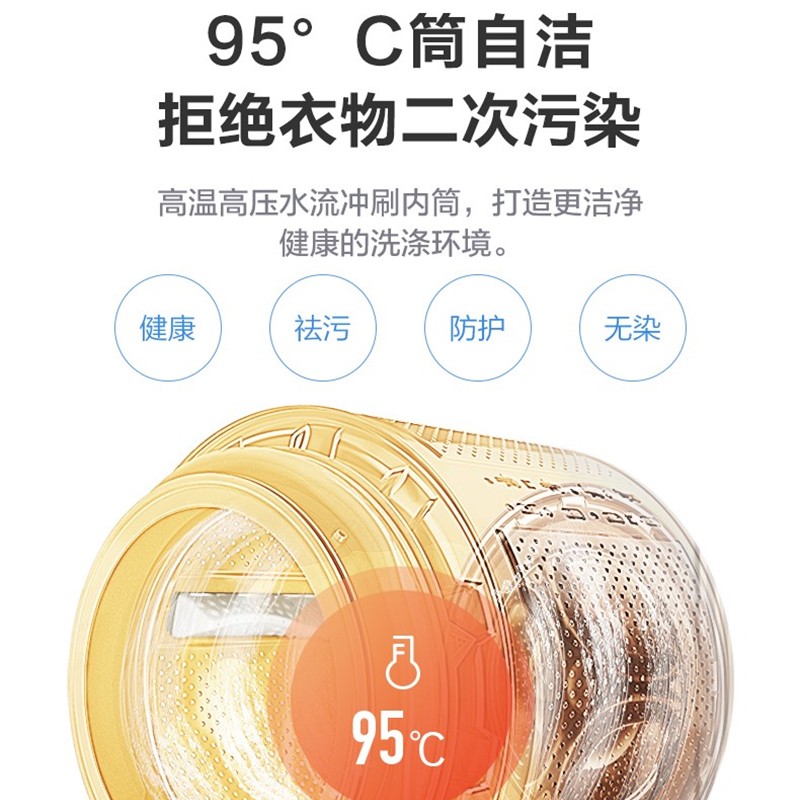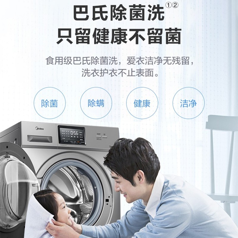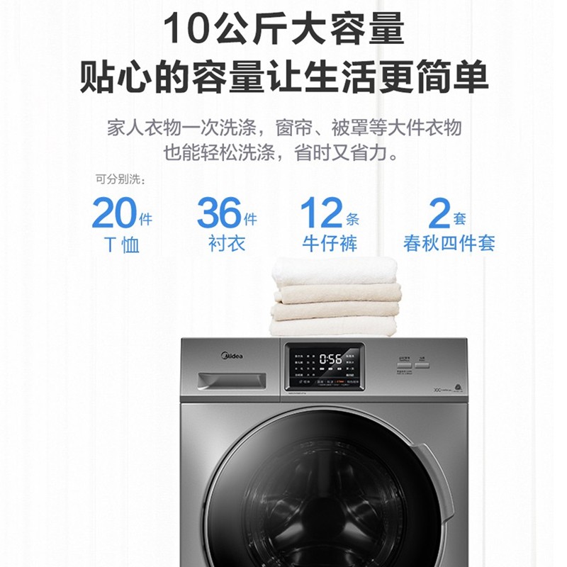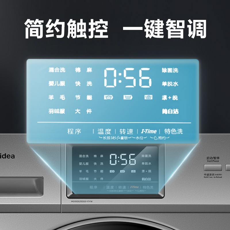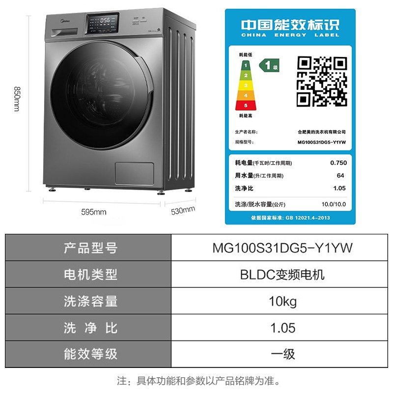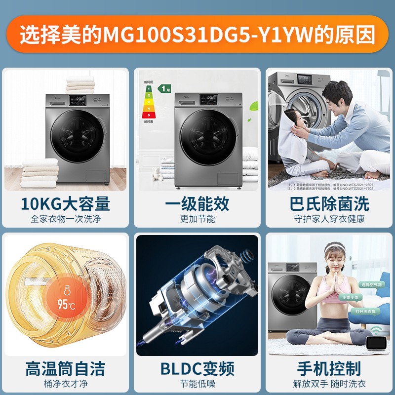 Midea美的MG100S31DG5-Y1YW滚筒洗衣机,洗涤容量达到了10公斤,配有BLDC变频电机。产品自带巴氏杀菌系统,搭配60℃相对低温有效杀菌,减少化学残留,呵护衣物纤维。抗菌门封圈,拒绝衣物二次污染,洗衣机支持95℃桶自洁功能,360°不留死角,有效清洗内筒壁,营造健康洗涤环境。拥有I-time智能时间控制功能,使得可以自由调节各种洗涤模式下的洗涤时间,内置有12种分类洗涤,满足用户多种洗涤需求,支持中途添衣和手机智联。上排水,洗净比为1.05,一级能效认证。外观尺寸为(深*宽*高)560*595*850mm。