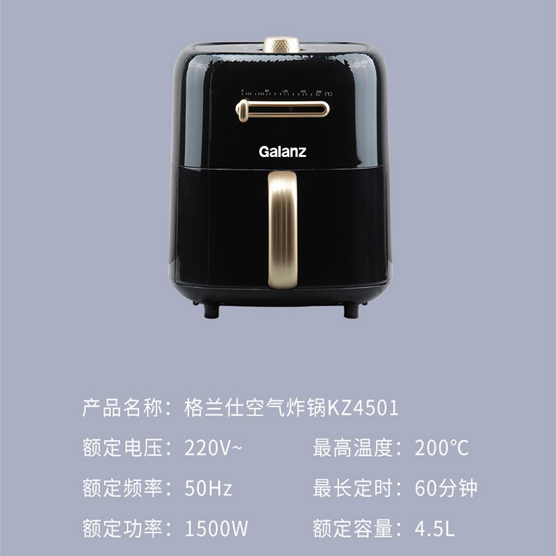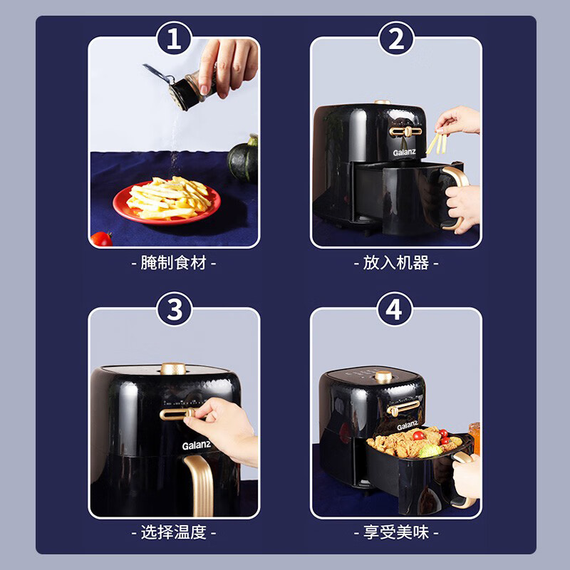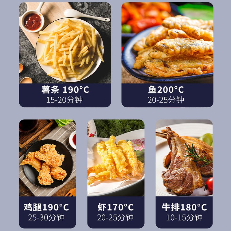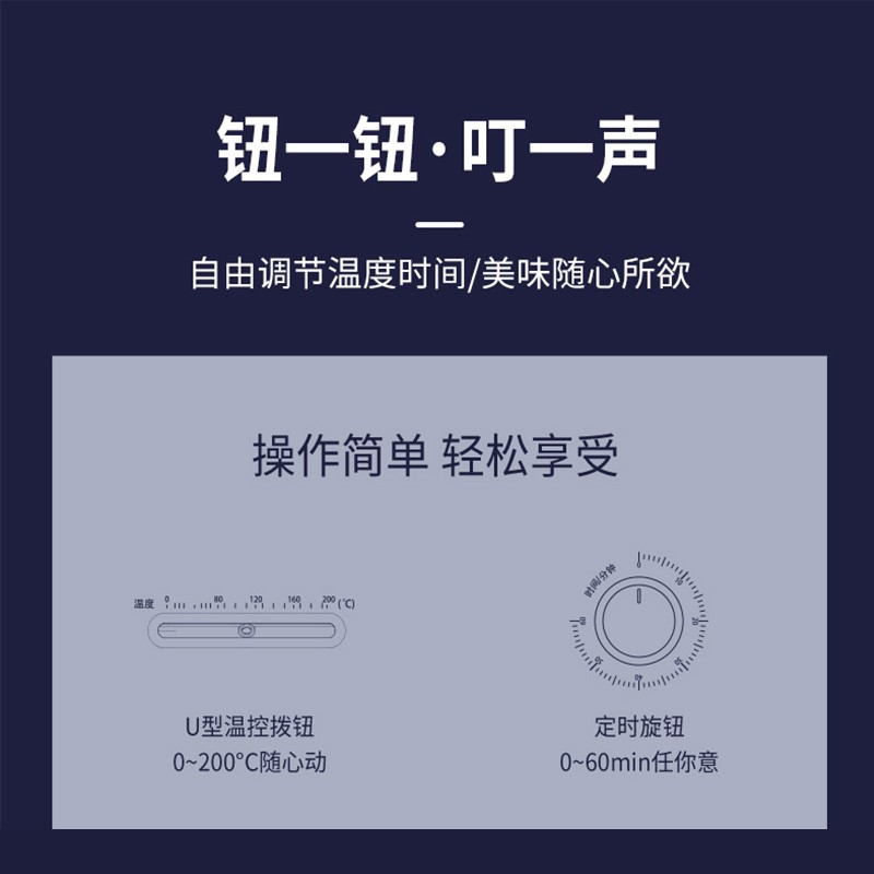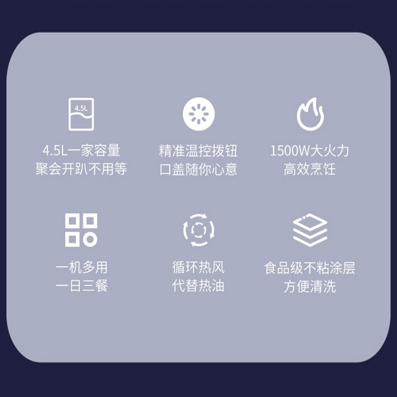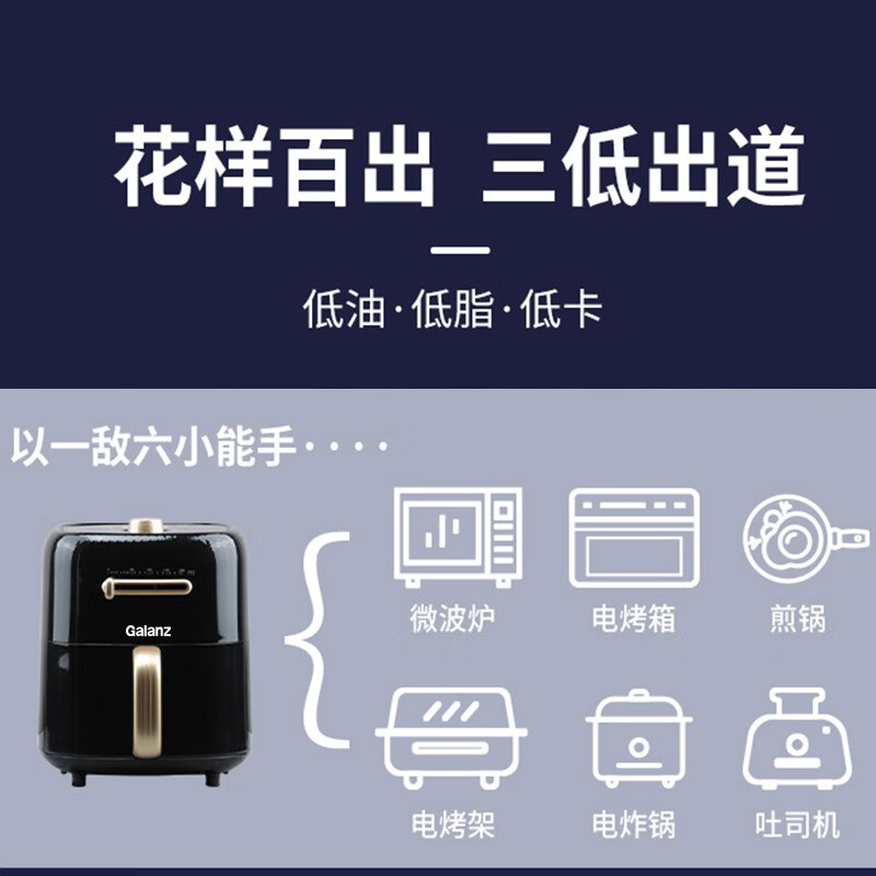 ♥外观:墨黑色,呈现亮面,家居百搭更耐脏。 ♥产品:双旋钮设计易操作、抽拉式炸篮取放方便、抽拉断电保护更安全、预制菜单易上手 ♥功能:多功能操作家用烹制多合一、大功率热风循环食物更加酥脆、智能定时不用等待、腔内不沾涂层不沾油易清洗。 ♥亮点:孩子家用零食机、烹制早餐机、烤肉机、面包机等,多合一家用神器