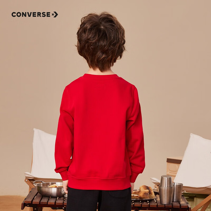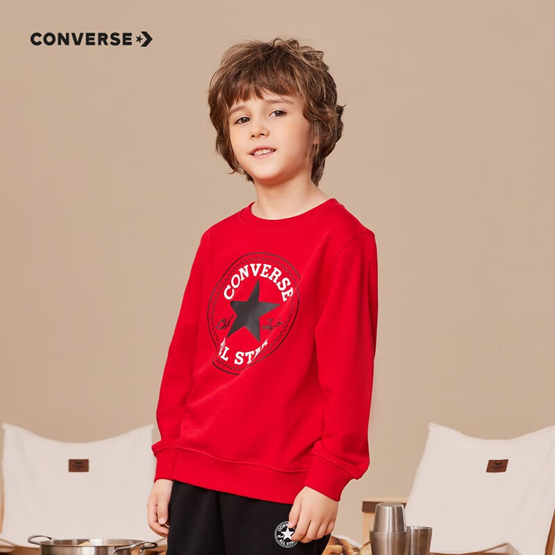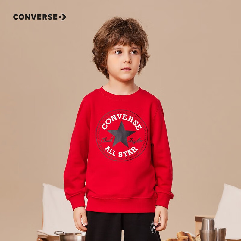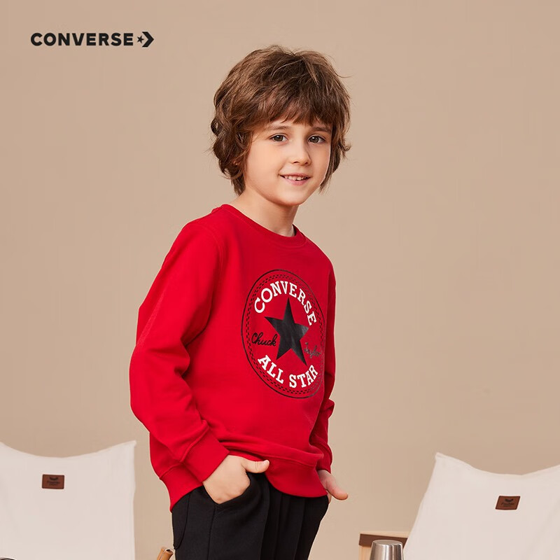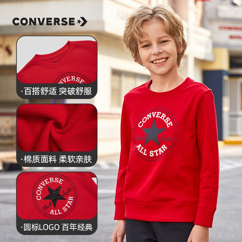 这款CONVERSE 男女童圆领套头衫卫衣,经典LOGO图案,醒目吸睛,彰显品牌质感。罗纹圆领套头设计,易穿好脱,版型简约大方,舒适好搭。多款多色可选,110cm-160cm尺码可选。