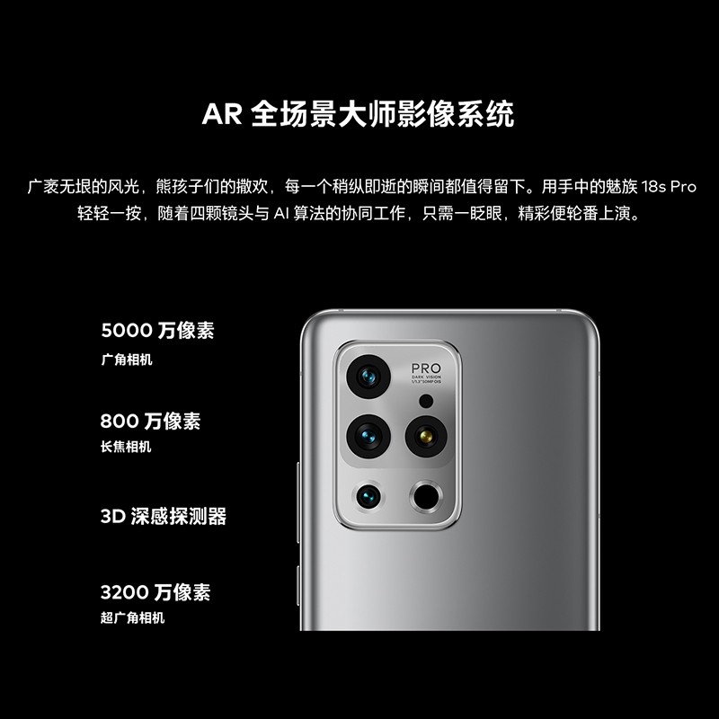 影像方面,魅族 18s 系列出厂预装最新的虹软算法,在人像、视频、夜景、防抖性能四大方面有所增强,且不需要用户手动操作,多数在 AI 状态仍然下自动完成。