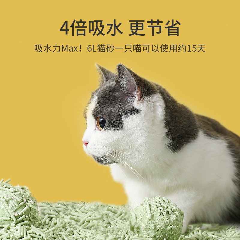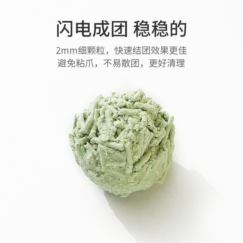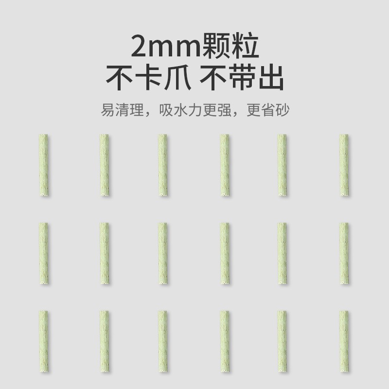 食品级原料误食无忧,选用纯绿色植物原料,气味自然,安全环保。天然植物香料告别色素,带来无负担健康生活。易清理,吸水力更强,更省砂。2mm细颗粒,快速结团效果更佳,避免粘爪,不易散团,更好清理。