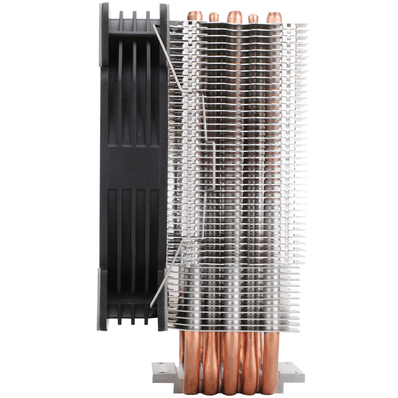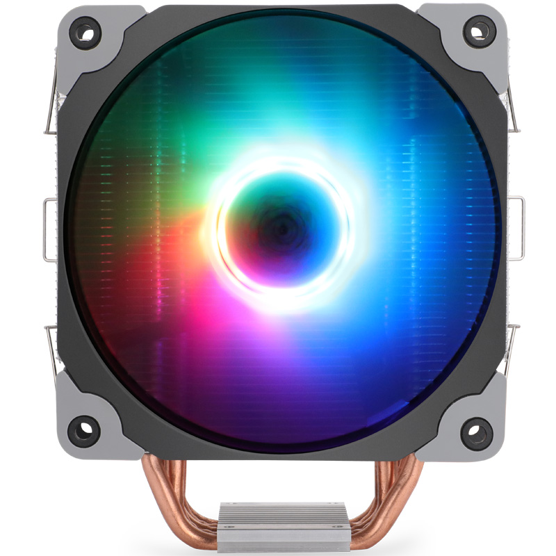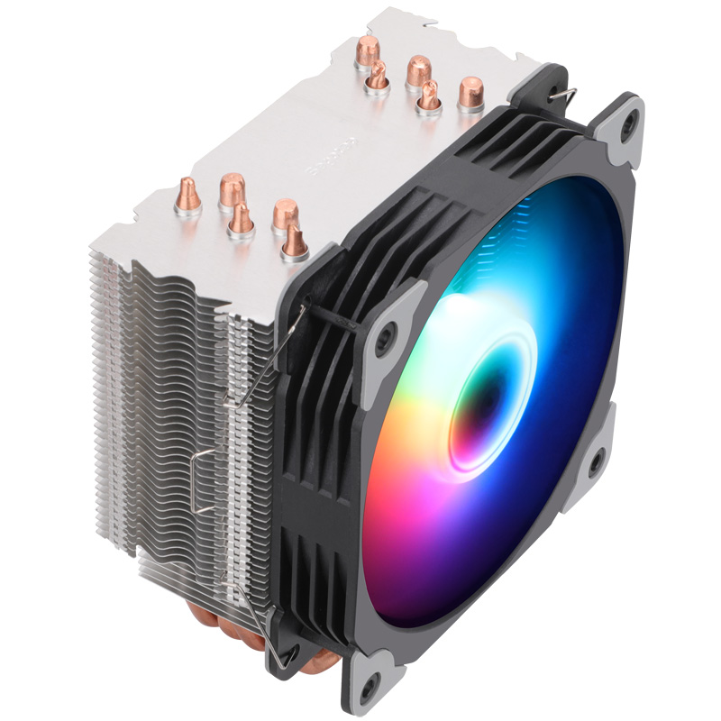 使用120mm液压风扇,支持RGB灯效,800-1500rpm转速,支持PWM智能调速,最大风量52CFM。U型结构5*6mm纯铜导热管,直触式镜面底座,穿Fin+扣Fin工艺散热鳍片,内含两款扣具,兼容AMD、intel平台。散热器尺寸125*148*85mm,风扇尺寸120*120*25mm。