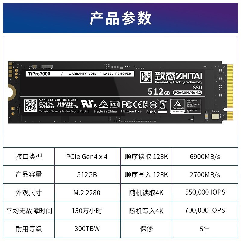 致钛 Ti Pro 7000 NVMe M.2固态硬盘,拥有512GB/1TB两种规格,采用长江存储第三代三维闪存芯片,采用TLC颗粒,单颗闪存芯片接口速度高达1600MB/S,写入寿命持久,1TB高达600TBW,配置 SLC Cache缓存和Xtacking 2.0技术,同时支持新一代 PCle Gen 4X4技术、 NVMe 1.4协议,最高可以达到 7400M/s 的顺序读写速度,该固态还配备了可拆卸式散热器,可自由组合厚达5毫米铝质散热片,还具有活孔设计、0.5毫米导热胶,可覆盖全部热源,同时兼容市面主流台式机、适配PS5尺寸。