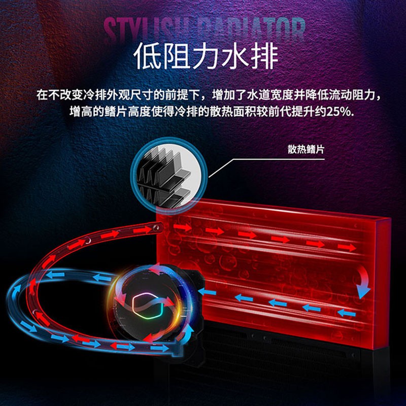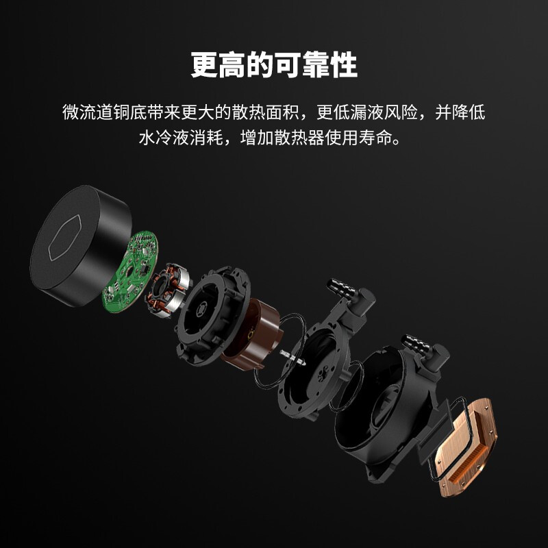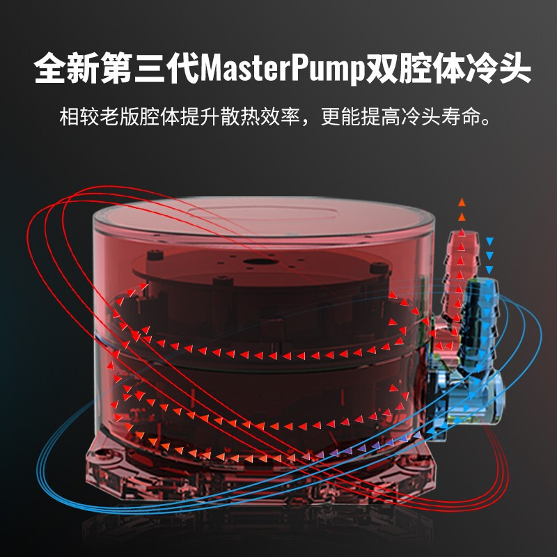 微流道铜底,车用级水冷密封材质EPDM,第三代MasterPump双腔体冷头,增高散热鳍片高度,散热面积较前代提升约25%,搭配62CFM风量、2.5mm H2O风压风扇。