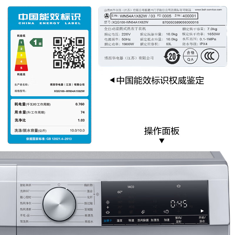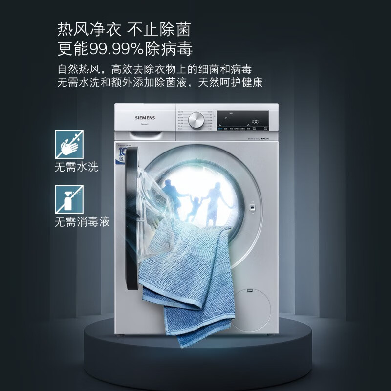 西门子这款型号为WN54A1X82W 滚筒洗衣机,10KG容量,自然热风,高效去除衣物上的细菌,除菌率高达99%。利用筒内低温蒸汽,净化衣物,搭配专业洗涤程序,先除菌后洗涤,安全不伤衣。90℃高温水,360。高频冲刷,先洗净再烘干,高效去污除垢,有效杜绝细菌滋生和交叉污染。产品尺寸:848*598*590mm