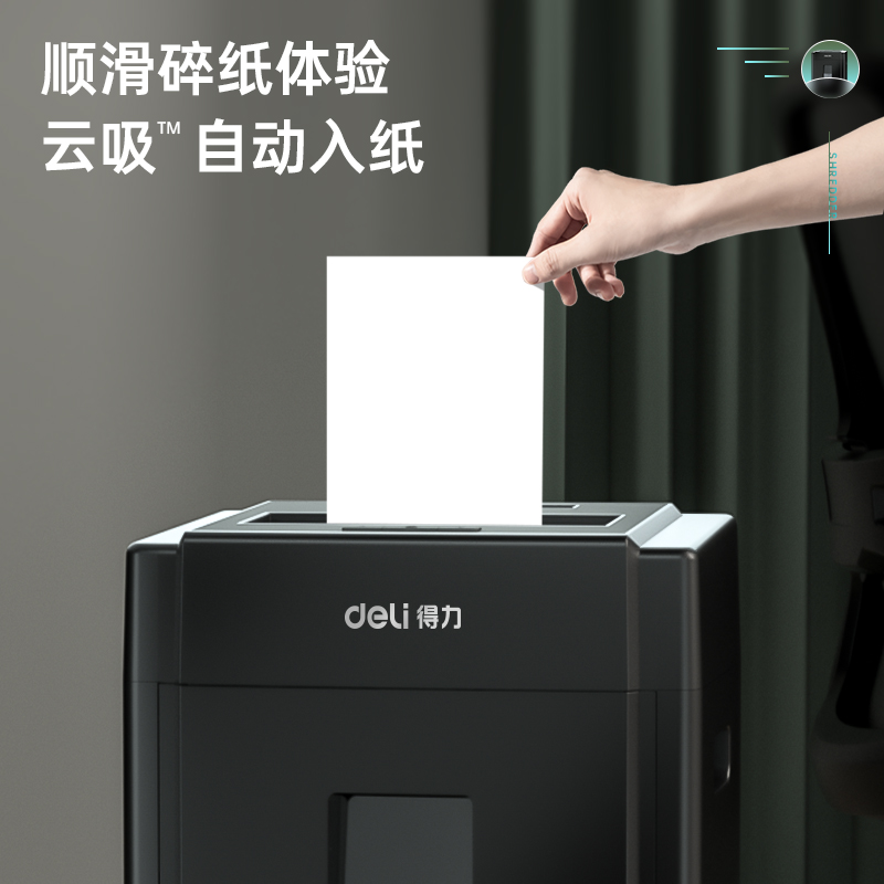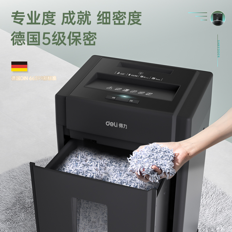 得力33043是一款保密等级为5级的碎纸机,定位于办公商用,该机型拥有米粒状的碎纸效果,商品毛重在12.64kg,纸箱容量为11-20L,单次碎纸张数为6-10张,噪音较小,最大的碎纸幅面为A4。可碎介质包括纸/光盘/卡/回形针等。