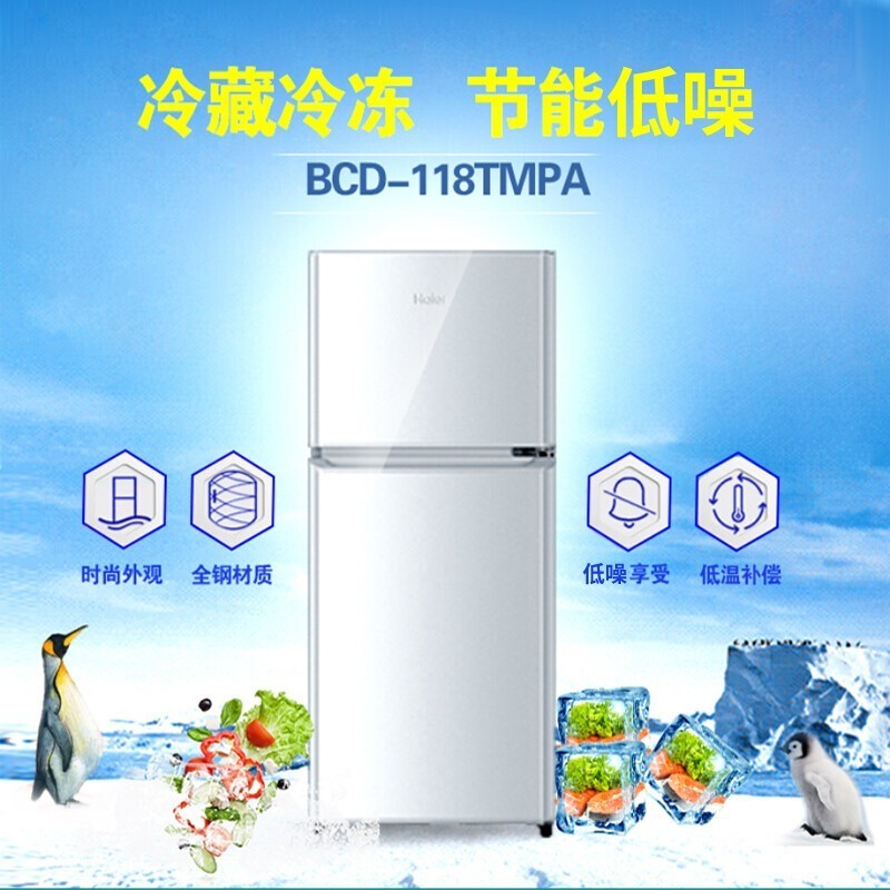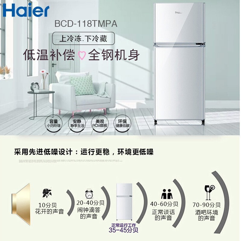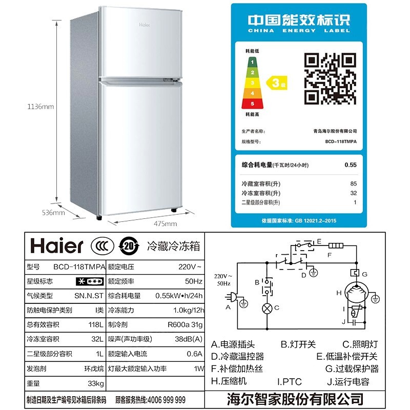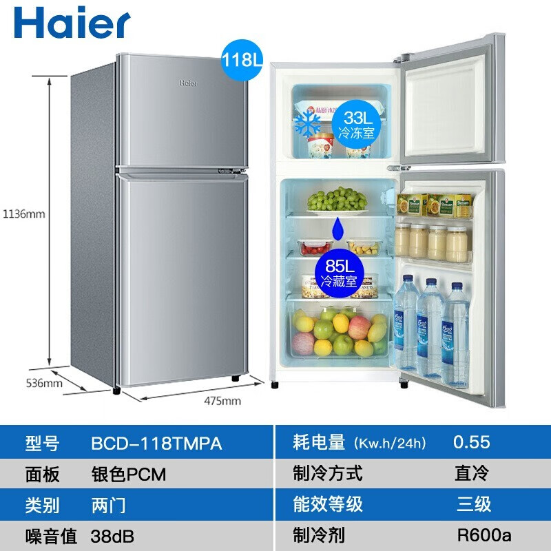 海尔BCD-118TMPA双门冰箱采用全钢机身后盖设计,耐磨损易清洁,内置格挡架支持自调节,满足日常多种存储需求。主要参数方面,总容积118L容量,其中冷藏室85L,冷冻室33L。定频压缩机,多模式电脑控温,38dB低噪音,直冷式制冷,R600a冷媒,2.5KG冷冻力,日均耗电为0.59kw/24h,国家3级能效,外观尺寸为475*536*1136mm。