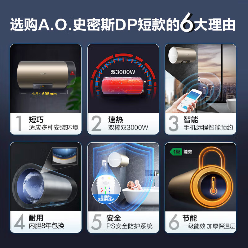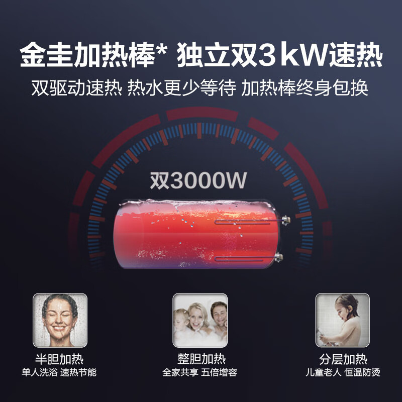 这款A.O.SMITH 史密斯 晶彩系列 EVDP 储水式电热水器,具有断电保护功能,时刻呵护家人的安全,使用更加放心;专利金圭涂层内胆,表面致密光滑,具有耐腐蚀、耐热和抗污垢的特点,可延长使用寿命,使用更省心;3000W速热功率,加热快速,使用热水无需过久等待;80摄氏度高温杀菌+整胆抗菌设计,抗菌率及杀菌率高达99.9%,让沐浴水质更放心,带来更好的沐浴体验;LED清晰触控屏幕,显示清晰明了,即便是家中有老人也能轻松使用。