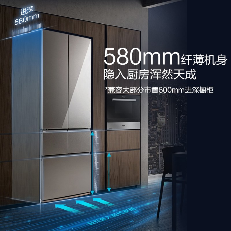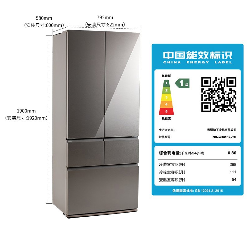 松下于2020年10月推出了纤雅•自由嵌入系列冰箱新品,该系列产品最大的亮点在于采用超薄58cm机身设计,冰箱腰线也与橱柜同高,可更好的实现嵌入式安装;此款NR-W461BX-TH为绚雅棕版本,搭载松下独有纳诺怡X技术,除菌除异味,同时还有松下特有的-3℃微冻保鲜技术,此外配备超声波加湿技术,可以主动加湿保鲜,同时搭载蓝光LED,通过模拟光合作用下的波长来保持果蔬新鲜;双宽幅变温设计,-25℃-7℃独立调温,不同食材均可找到对应的温度存放;顶置压缩机,释放下层储藏空间,总容积453L,其中冷藏室容积288L、冷冻室容积111L、变温室容积54L;外观方面,采用无边框玻璃门设计,并有内藏式触控面板、全开式抽屉等设计,产品尺寸为792×580×1900(mm)(宽×深×高);日耗电量0.86kW·h,达到一级能效标准。