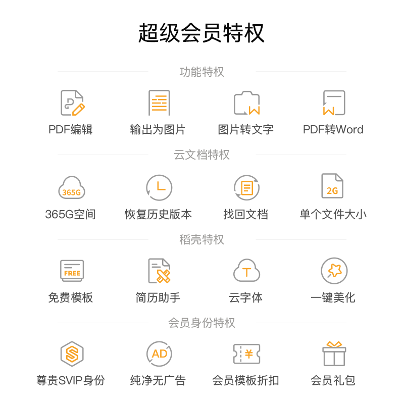 WPS超级会员包含了WPS会员和稻壳会员的全部特权。支持电脑,手机和平板。像PDF转换如PDF转Excel、转Word,PDF拆分,PDF合并,数据恢复,数据重复处理,图片高清放大,文档修复,全文翻译,邮箱Gmail加速,海量的模板资源,PPT一键美化,PPT设计素材,云存储空间等等功能都很实用,职场人士必备。