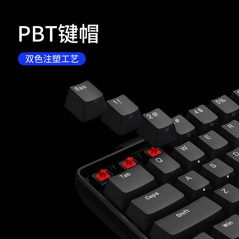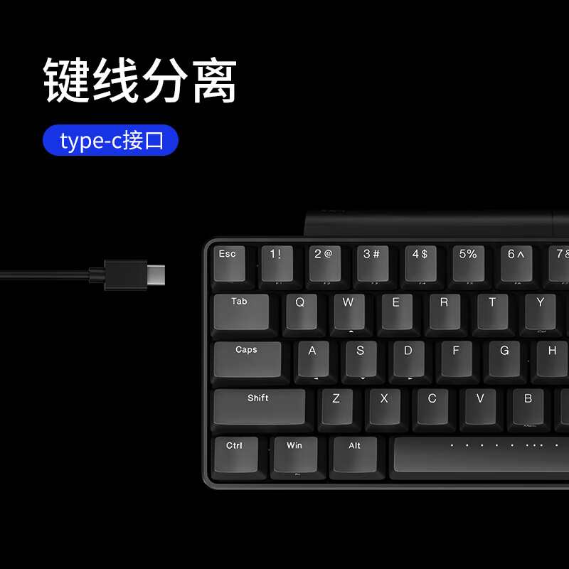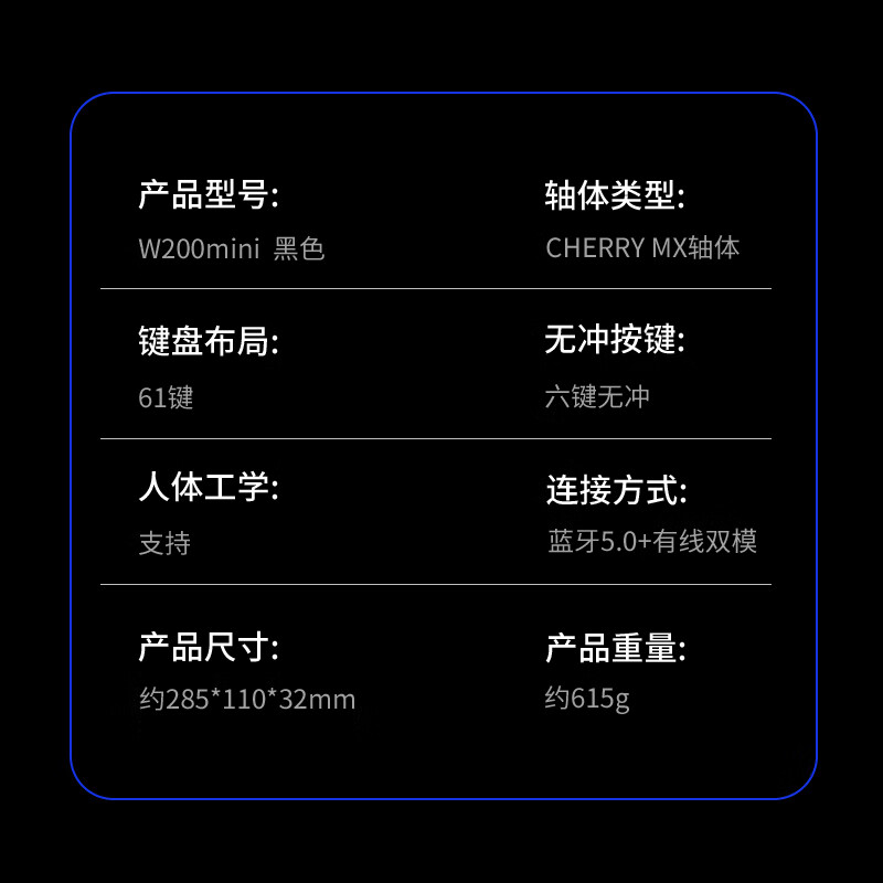 搭载Cherry机械轴体,PBT侧刻键帽,61键布局,2.4G无线连接,两节七号电池供电,支持360小时连续输入,尺寸为28.5*11*3.2cm。拥有Workman/Dvorak/Colemak/Qwerty四种配列,可对左win/右Fn/Caps键等常用键位进行快速切换。