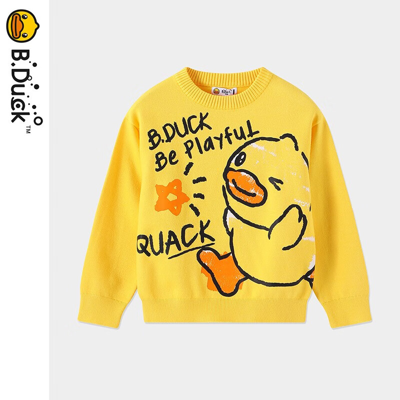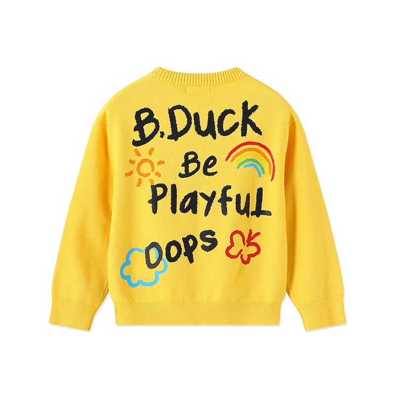 该商品B.Duck 儿童秋冬毛衣,小黄鸭与字母卡通图案个性潮流,衬出阳光爽朗的少年感,选用棉感面料打造触感细腻,柔和亲肤,带给孩子舒适的穿着感受。
