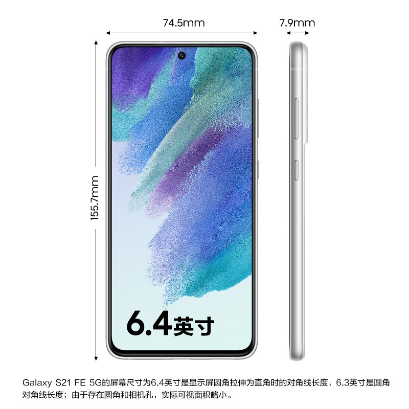 三星 SAMSUNG Galaxy S21 FE 5G手机,整体机身155.7×74.5×7.9毫米,重量为390g,相比上一代更小更薄,背面设计极简,相机模组垂直排列,背面由优质的塑料制成,覆盖有康宁大猩猩玻璃Victus。极致简约的外观,让整个手机非常有质感。